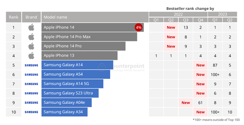 Samsung, в свою очередь, имеет в активе места с пятого по десятое со смартфонами Galaxy A14, A54, A14 5G, S23 Ultra, A04e и A34.