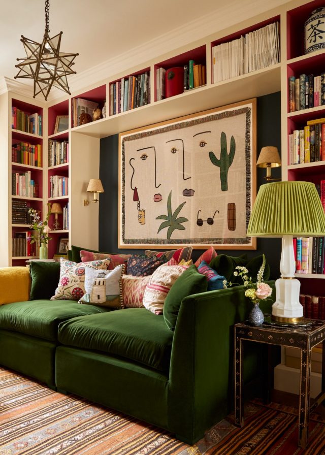 В результате получился эффектный предмет мебели, в который можно буквально погрузиться — человеку невысокого роста будет трудно достать ногами до пола — и смотреть телевизор. Стоит отметить, что этот диван выигрывает благодаря потрясающей обивке из «Елового хлопкового бархата» от Rose Uniacke. А с дюжиной декоративных подушек с различными смелыми принтами и узорами он становится не только функциональным сиденьем, но и визуальным центром комнаты.