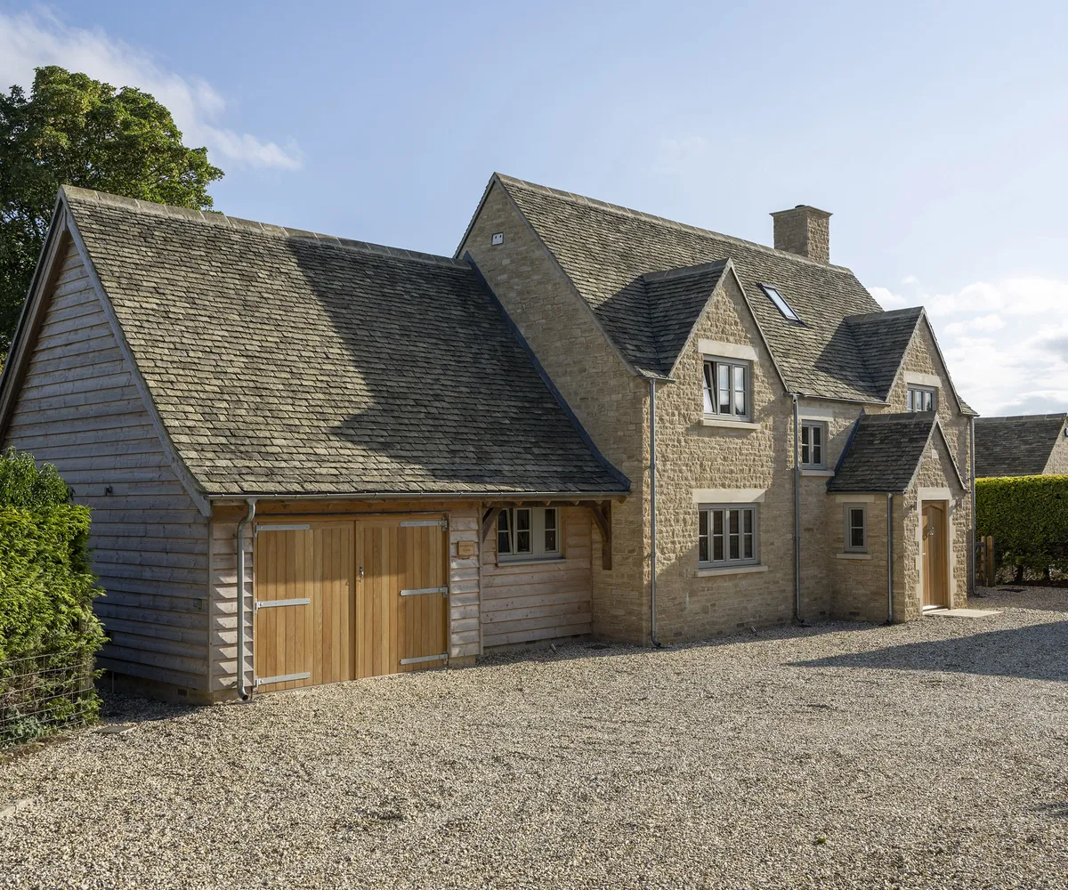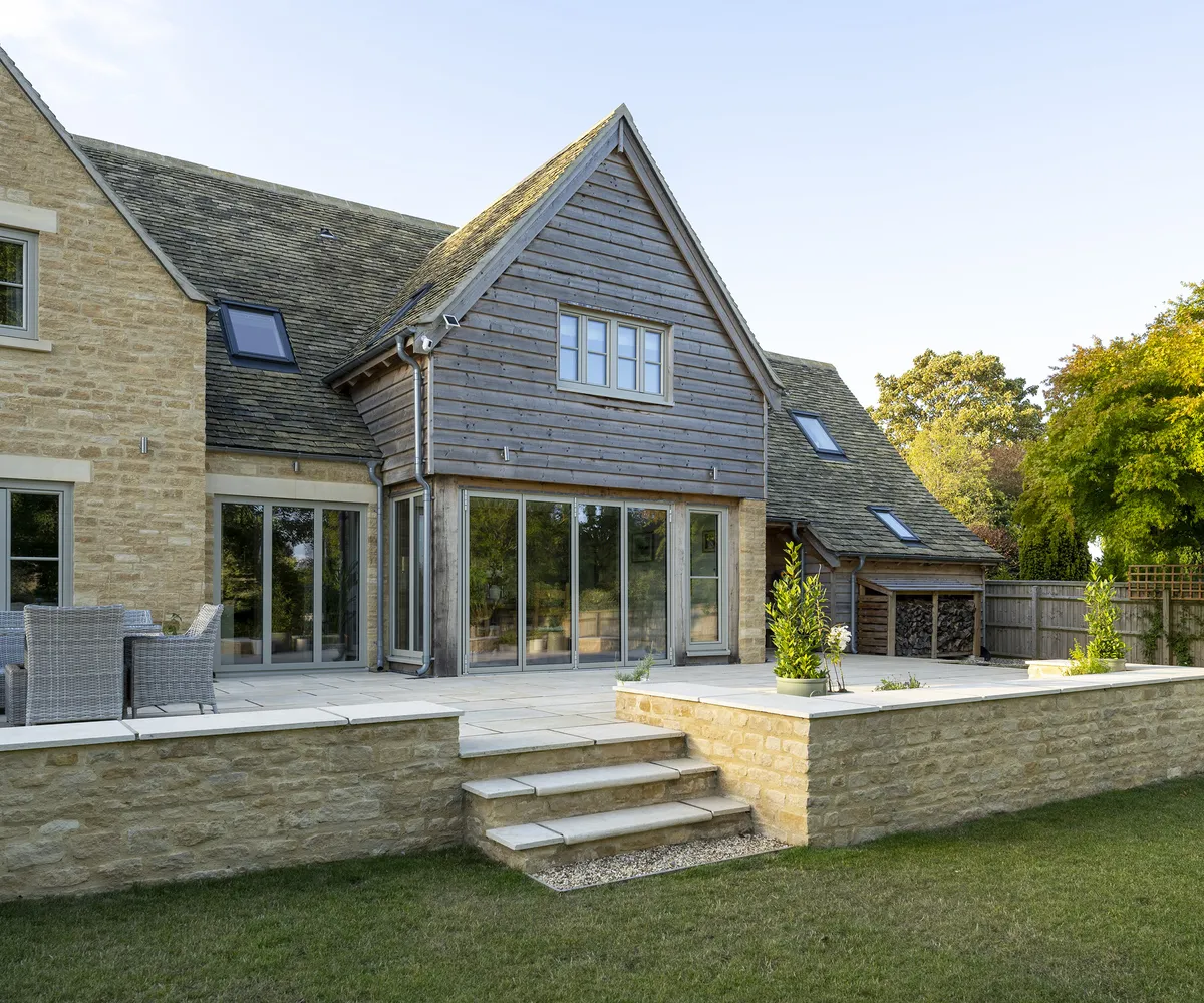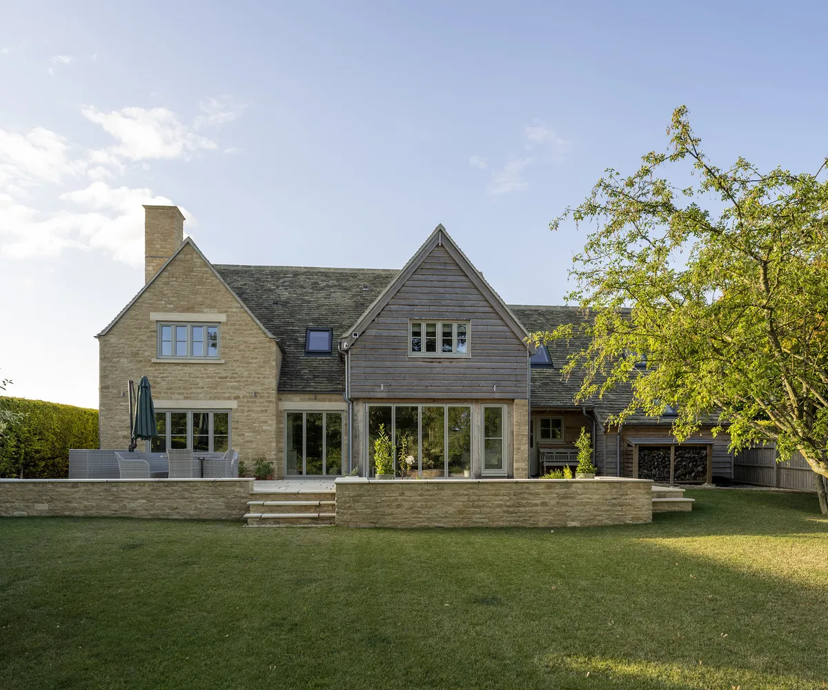 Благодаря мягкой палитре золотистого котсуолдского камня, обшивке из натурального дерева и окнам с тройным остеклением, окрашенным в нежно-зелёный цвет, дом выглядит очень красиво.