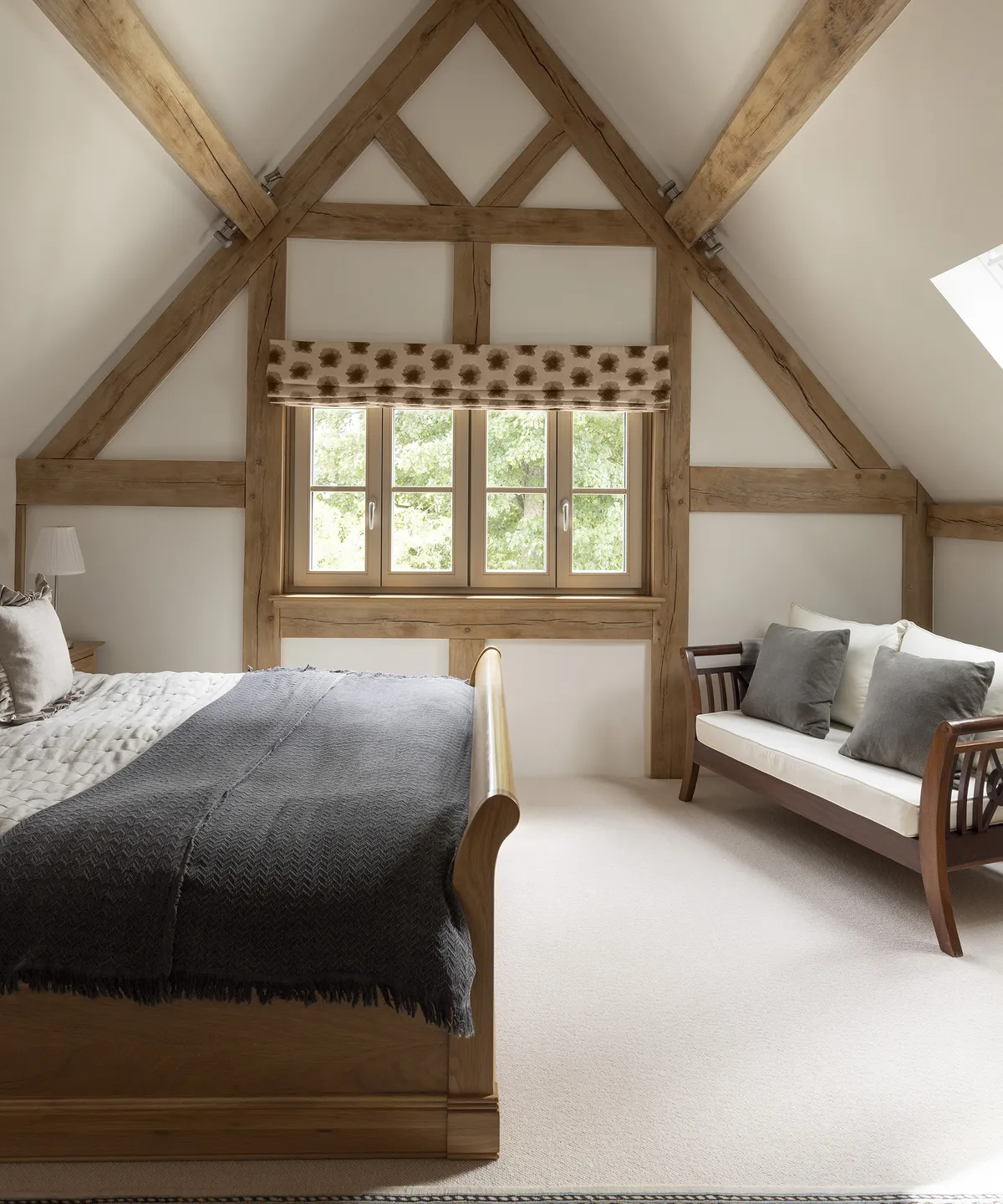 Главная спальня с величественным сводчатым потолком и открытыми дубовыми балками напоминает большой амбар. Благодаря окнам с двух сторон в помещении светло и просторно.