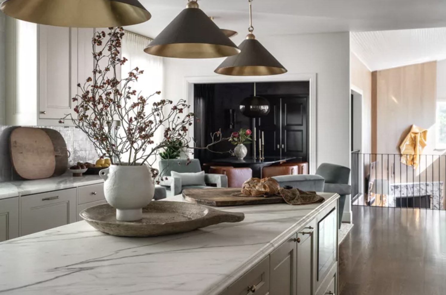 Блестящие глянцевые столешницы — это классика, но дизайнеры все чаще выбирают покрытия, которые добавляют уюта. Шелдон Харт из студии Harte Davis отмечает, что они часто используют кварцит с матовой или фактурной отделкой. Матовая поверхность остается гладкой и ровной, но без блеска. А фактурная обработка придает камню мягкость.