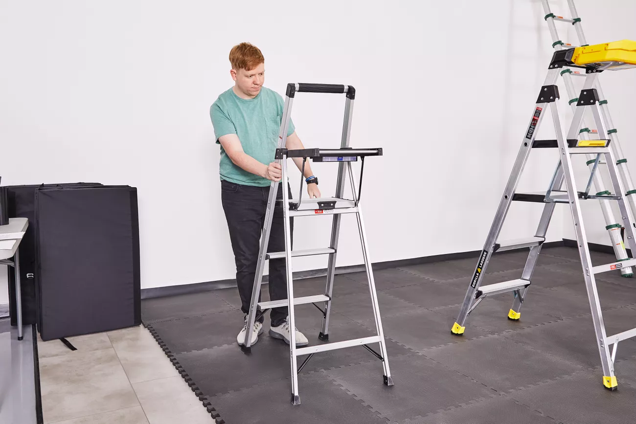 Нам также понравилось, что в комплекте идет сумка для инструментов, которая надевается на верхнюю ручку. Это позволяет держать все необходимое под рукой и не наклоняться за каждой мелочью. Во время домашнего тестирования мы пользовались этой лестницей почти каждый день, чтобы доставать вещи с высоких полок по всему дому и в гараже.