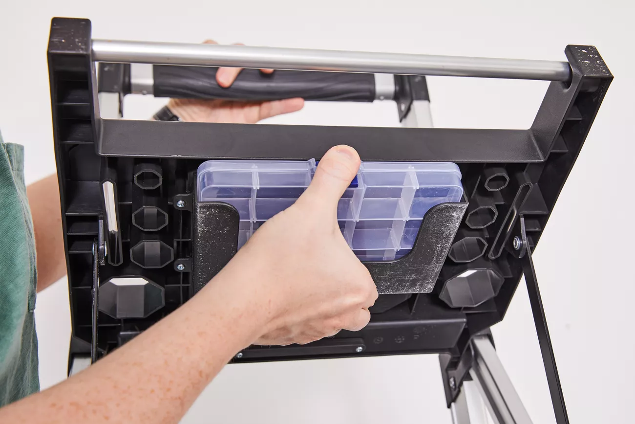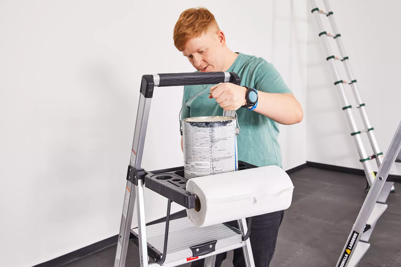 Главная фишка этой модели — удобный лоток для инструментов. Он магнитный, поэтому можно не бояться, что винты и гвозди упадут на пол. Есть даже держатель для бумажных полотенец, который пригодится, например, когда вы моете окна или вытираете пыль.