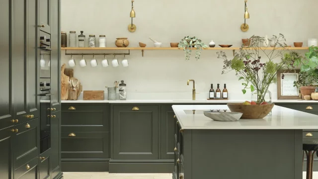 «Открытые стеллажи, будь то из переработанной древесины или шикарного минималистичного стекла, могут по-настоящему оживить стену», — комментирует Луиз Гроссман из The Used Kitchen Company. «Просто не беспокойтесь о том, чтобы заполнить каждый сантиметр пространства. Хорошо расположенная ваза с цветами, свечи, бокалы для вина или даже стопки тарелок могут выглядеть просто и шикарно».