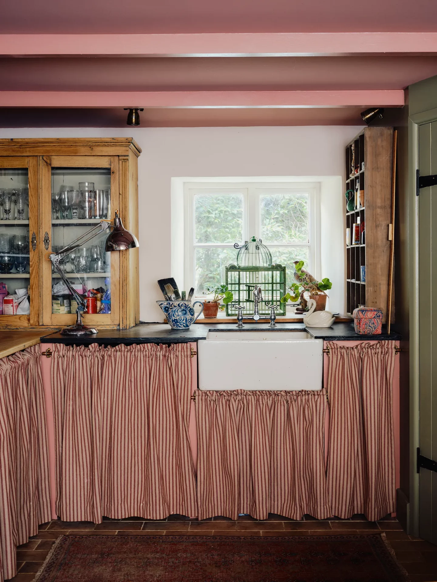 В лондонском доме Матильды Гоуд она сочетала стеновые панели Farrow & Ball «Банча» зелёного цвета с занавеской под столешницей из ткани Иэна Манкина, чтобы сделать комнату более уютной и мягкой. Над занавеской проходит перекладина, на которой можно сушить и проветривать одежду.