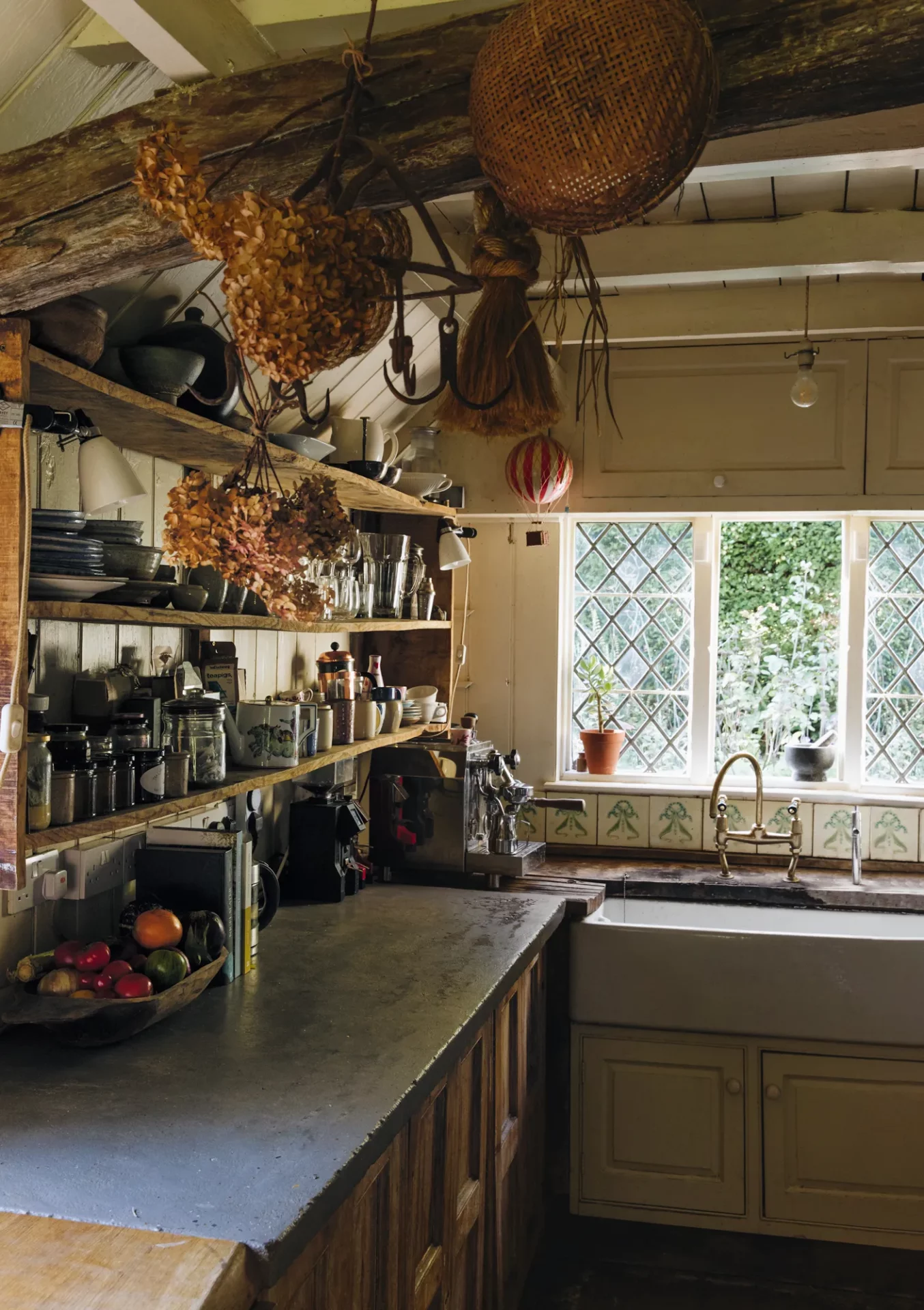 На кухне того же дома на одной полке вразнобой расставлена разнообразная керамика, в которой растут не менее разнообразные растения.
