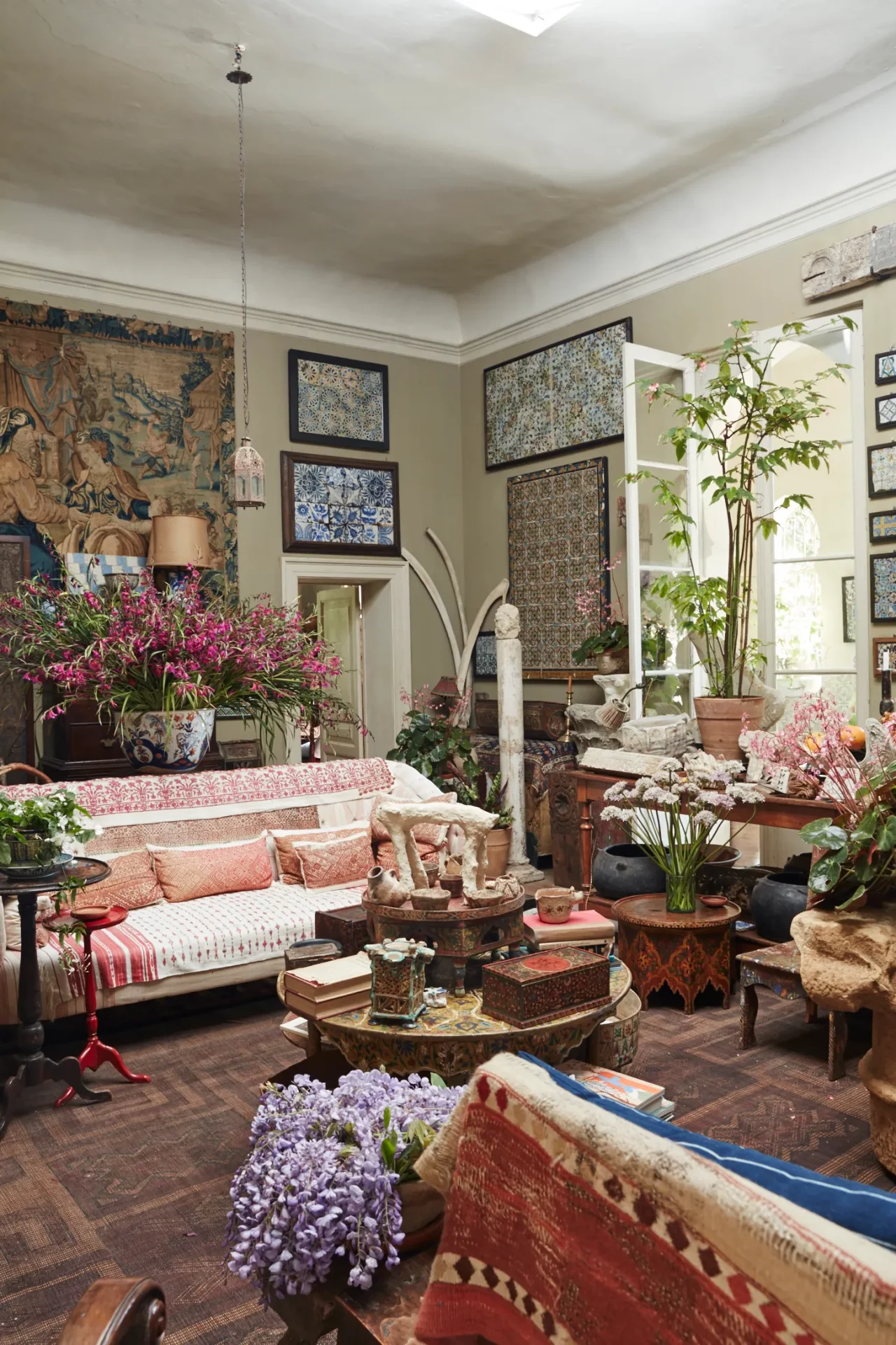 Обратите внимание на богато украшенный дом Умберто Пасти в Танжере — это образец цветочного максимализма, который идеально вписывается в контекст этой сокровищницы. С другой стороны, на противоположном конце спектра находится одинокий фикус лировидный (очень популярное комнатное растение), который эффектно выделяется на фоне лаконичной современной ванной комнаты в вилле Уильяма Смолли.