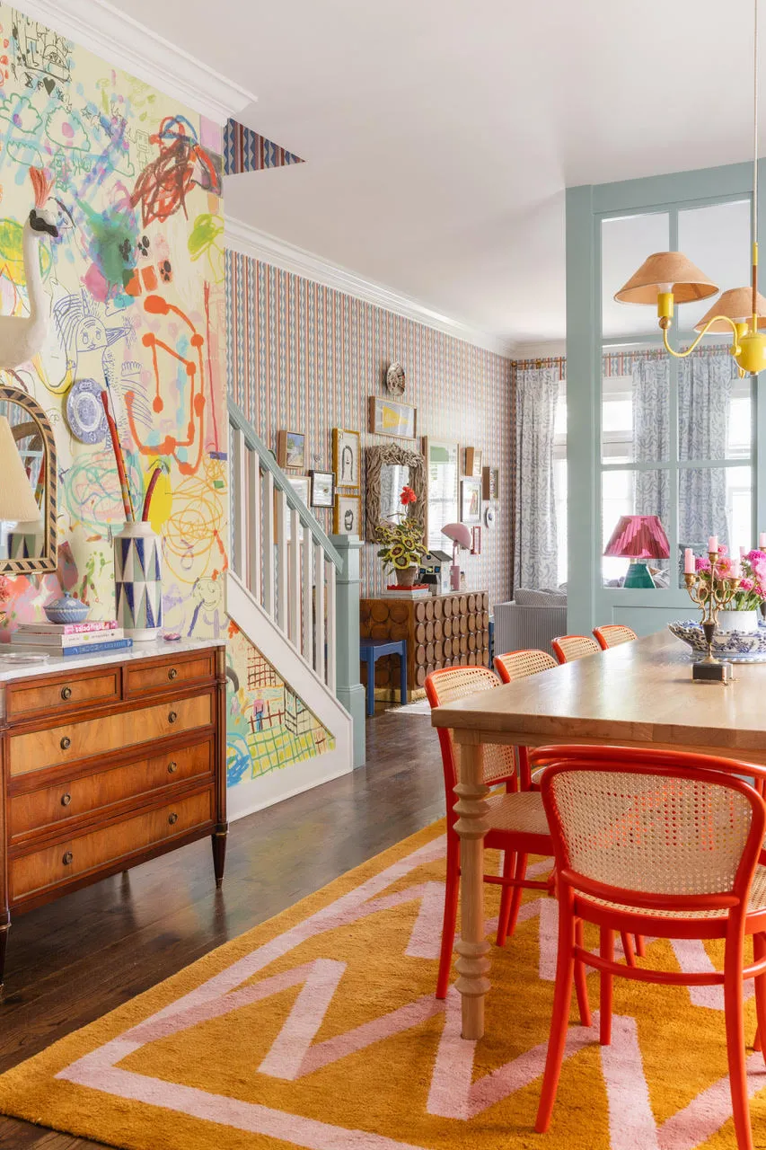 В своей столовой она пошла ещё дальше, обратившись в нэшвиллскую студию по производству обоев New Hat, чтобы превратить каракули её детей в индивидуальное настенное покрытие — обширный многослойный гобелен из каракулей, форм и цветов. На фоне плетёных кресел, цветочных композиций и позолоченных канделябров эффект получается почти поразительно элегантным. «Это стало центральным элементом нашего дома; это не просто дизайнерское решение, а семейное наследие», — говорит она. «Детское творчество помогает нам понять, что такое дом на самом деле, — это отражение людей, которые в нём живут, — добавляет она. — Дело не в совершенстве или лоске, а в индивидуальности и истории».