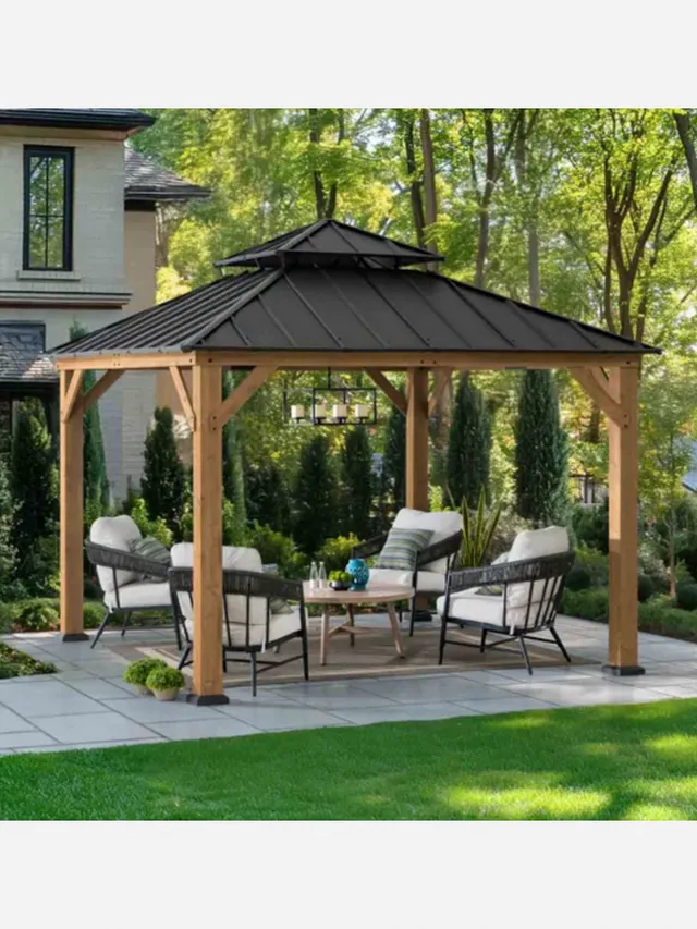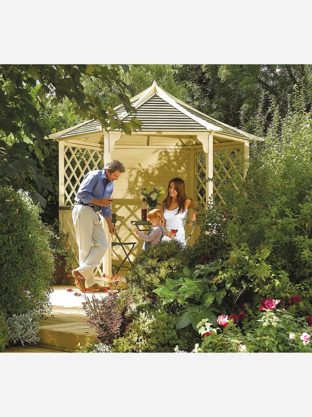 Возможно, всё, что вам нужно для укрытия, — это простая беседка. Как только вы начнёте изучать вопрос, вы поймёте, насколько широк выбор: от простых брезентовых беседок, которые можно установить за считаные минуты, до более прочных конструкций с деревянным каркасом и цельной крышей. Дешёвые и яркие складные беседки можно найти в House of Tents. Если вам нужно что-то более стильное и долговечное, выберите 4-метровую палатку Bell Tent Plus от Boutique Camping. Он достаточно большой, чтобы под ним можно было разместить приличное количество садовой мебели для создания крытой зоны отдыха или обеденной зоны.