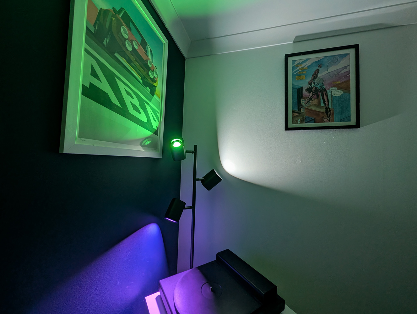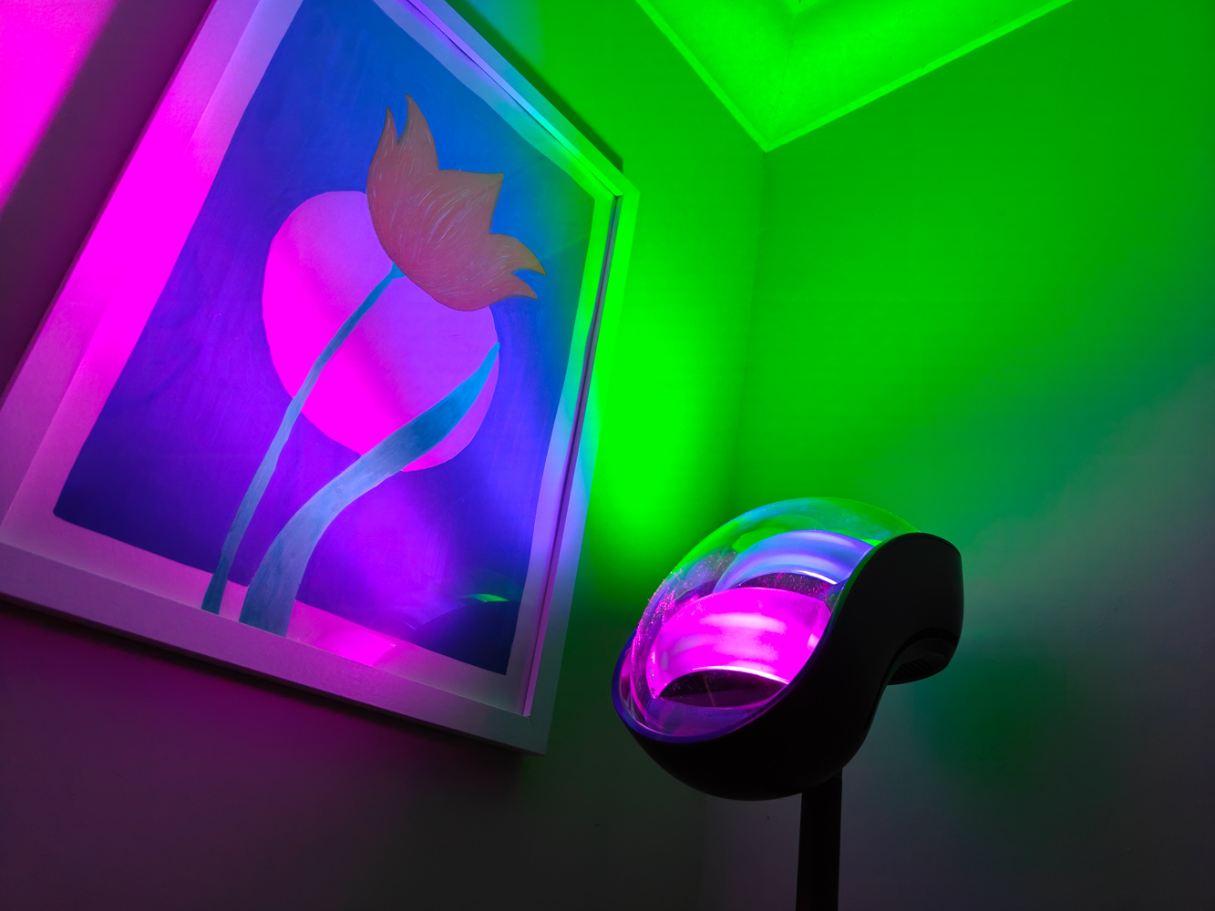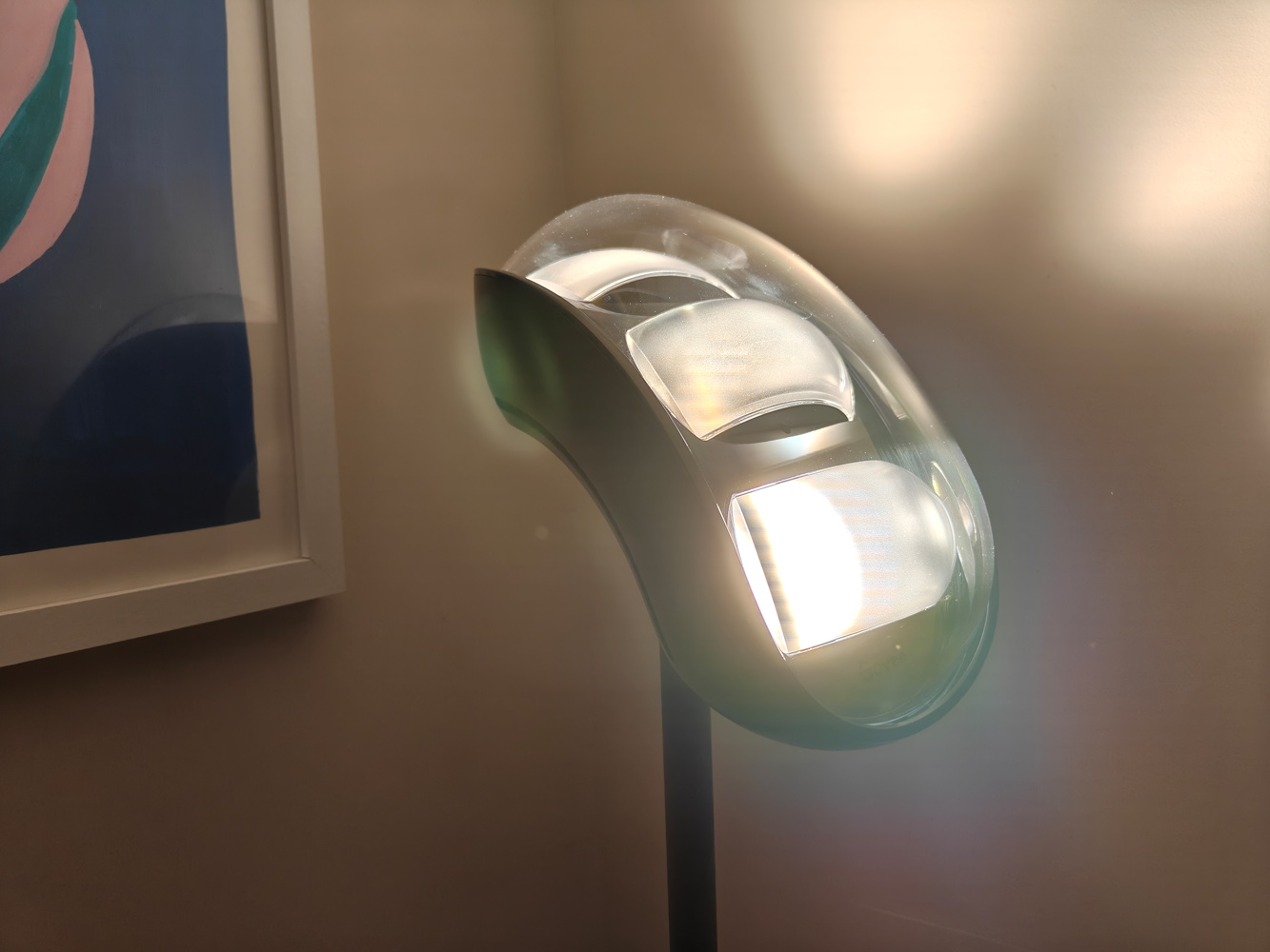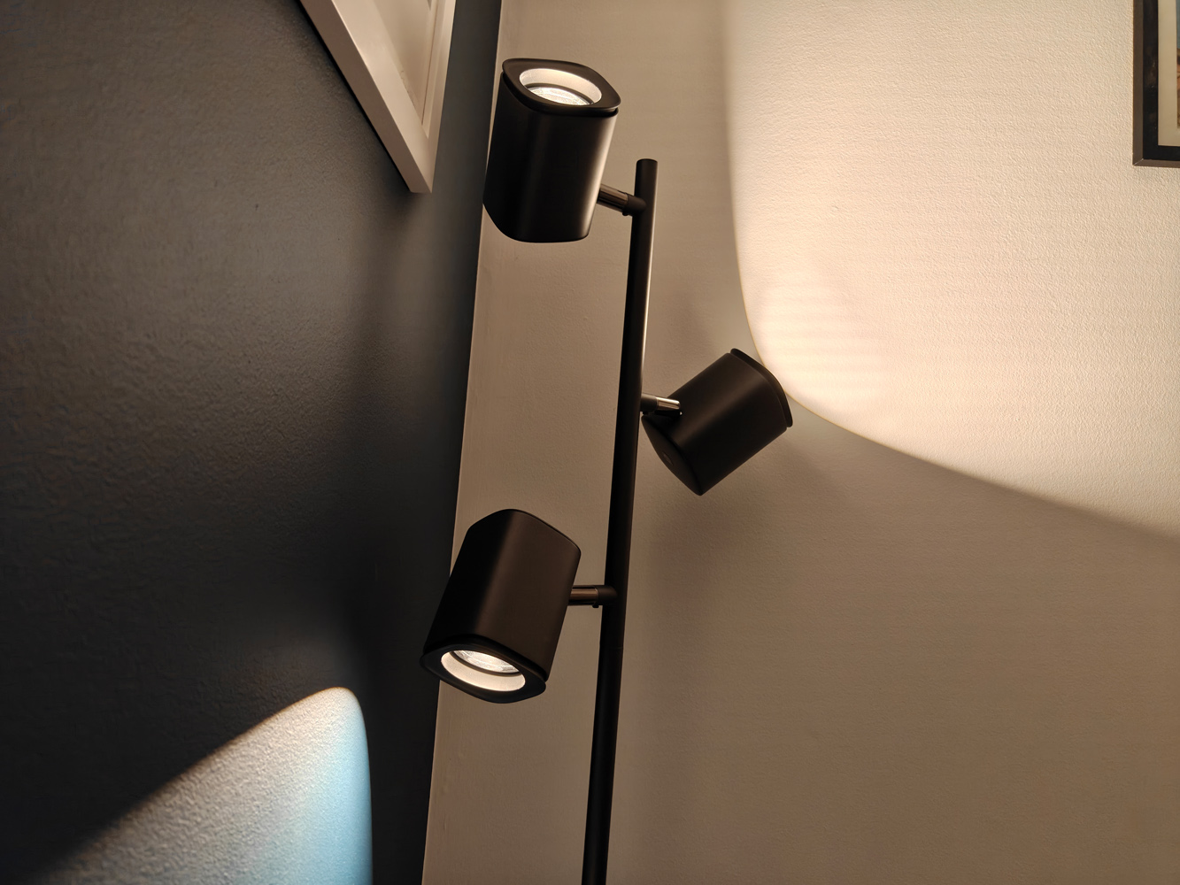 В этой штуке есть три больших RGB-подсветки, каждая из которых расположена под небольшим углом, а саму лампу можно наклонять и поворачивать, чтобы добиться нужного освещения. Рассеивающие отражатели над каждой внутренней лампой помогают равномерно распределять свет (по данным Govee, на площади 16 м²). Единственным способом создать тёмные пятна было поставить лампу вплотную к стене.