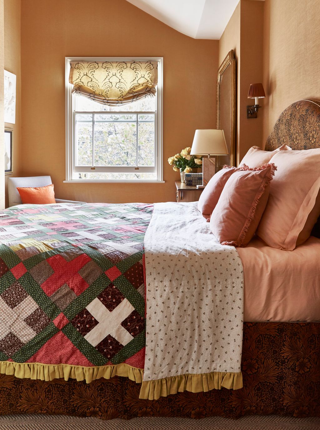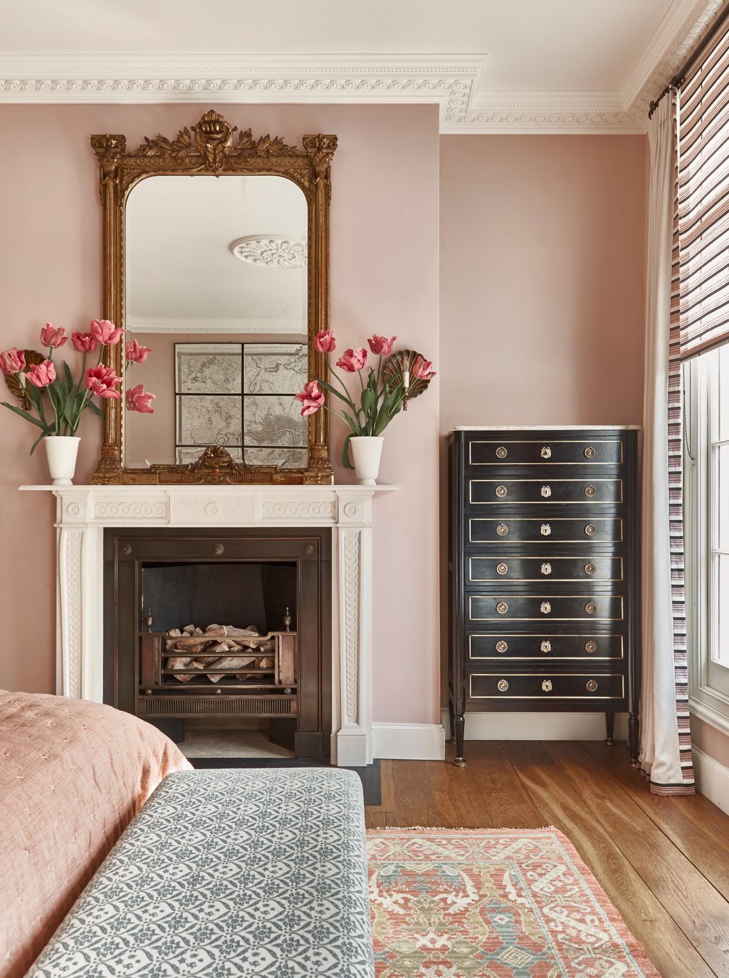 Стены, окрашенные в сиреневый цвет «SC234» от Papers and Paints, дополняют изголовье кровати из хлопка «Branches de Pin» бежево-серого цвета от Madeleine Castaing. Абажур из шелка дюпион цвета античной розы Pooky гармонирует с подушками с блочным принтом «Capilla» и вышитым покрывалом от Birdie Fortescue.