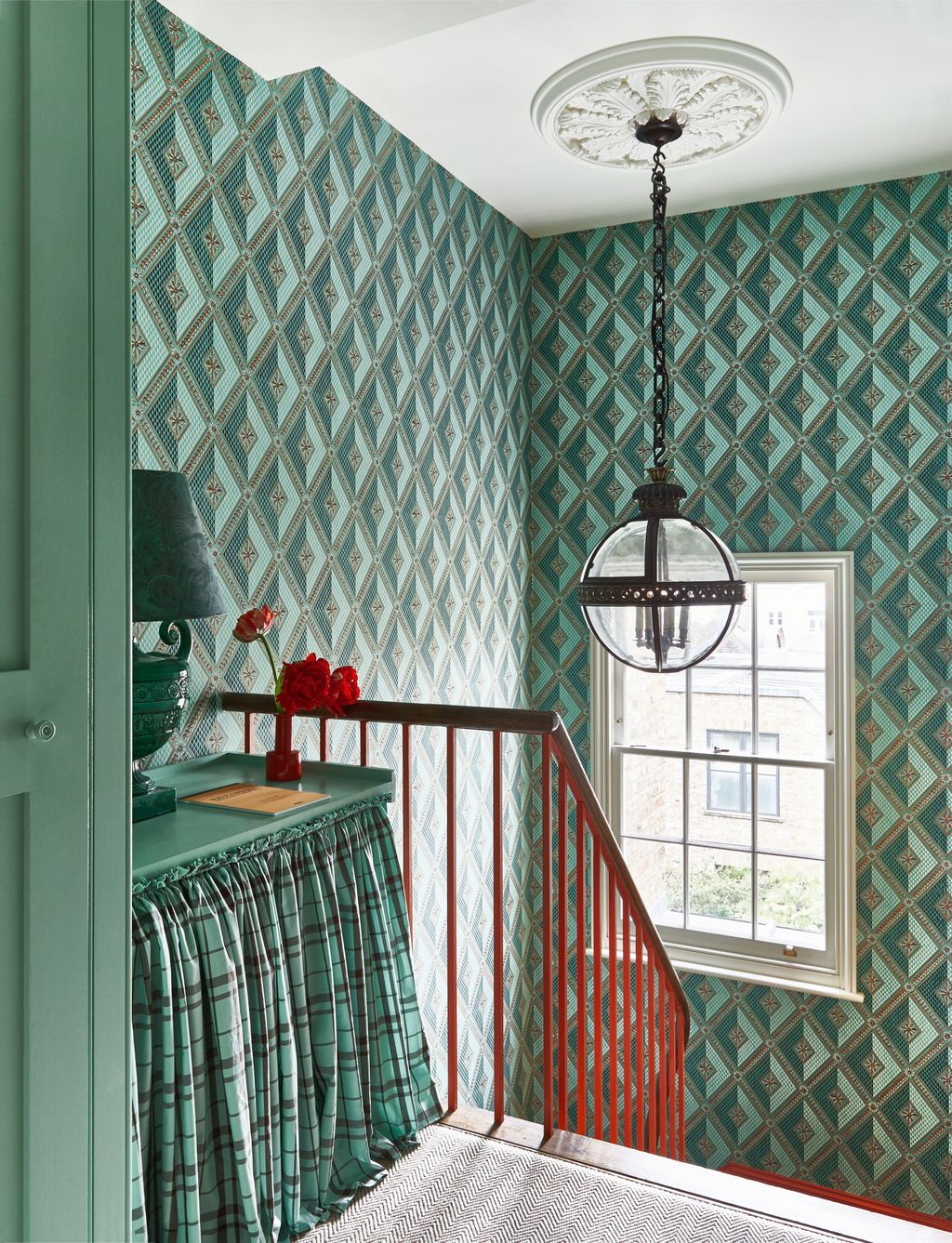 В интерьере преобладают узоры: обои «Philadelphia Harlequin D» от Adelphi и юбка для стола, сшитая из найденной в интернете ткани. Над лестницей висит подвесной светильник «Original Globe» от Jamb, а балясины и плинтус выполнены в ярком оранжевом цвете «SC546» от Papers and Paints.