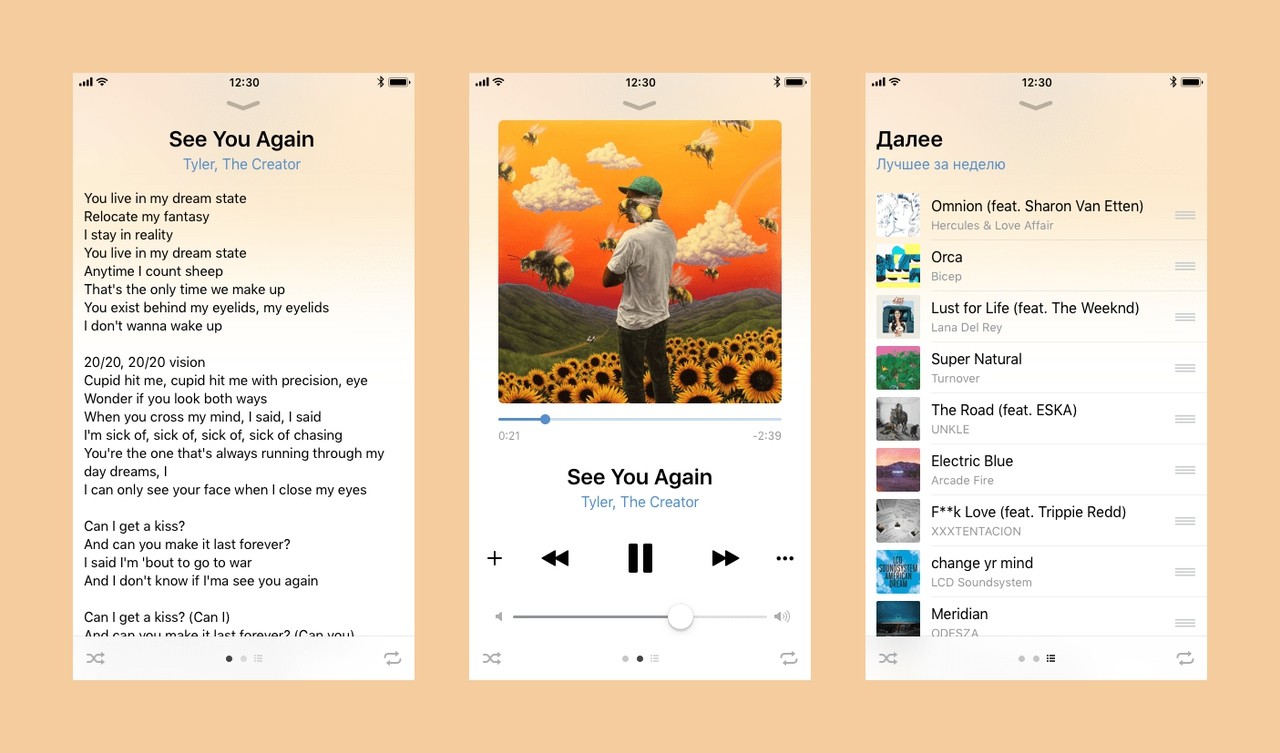 - Изменился дизайн Аудиоплеера. Экран с текущей композицией стал центральным, и появилась возможность свайпом переходить к тексту песни и к плейлисту. Плейлист также получил отдельную иконку.