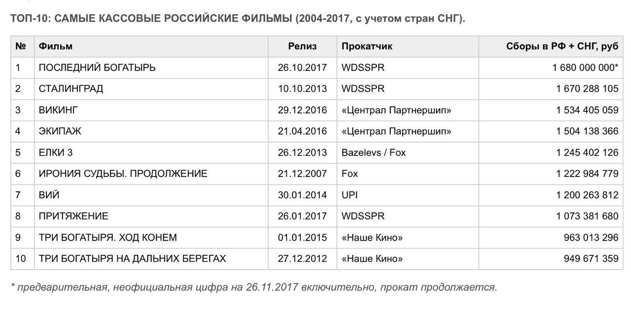 По итогам последнего уикенда фильм-сказка «Последний богатырь» стал самой кассовой отечественной лентой, обогнав предыдущего рекордсмена, фильм «Сталинград» Федора Бондарчука. За пять недель проката фильм, основанный на сюжетах русских былин и сказок, собрал 1,68 млрд рублей, сообщается в «Бюллетене кинопрокатчика».