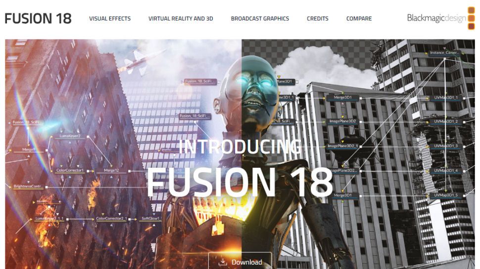 Blackmagic Fusion — один из лучших программных инструментов для создания визуальных эффектов, предназначенный для профессиональных специалистов по визуальным эффектам, которым требуется рендеринг профессионального уровня. Основные функции включают в себя компоновку видеозаписей с 3D-моделями, работу с виртуальной реальностью 360° и стереоскопическими 3D-эффектами.