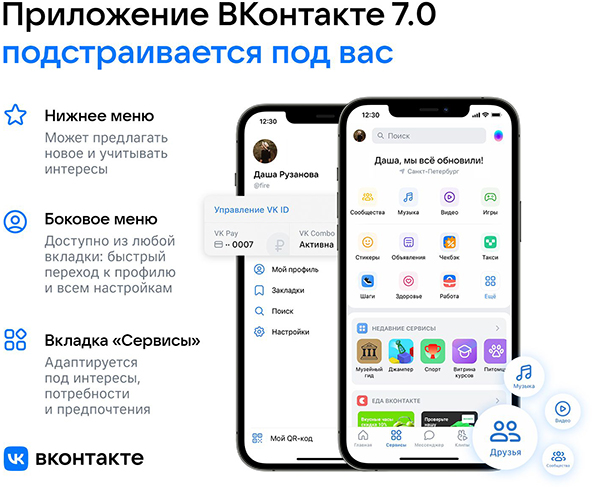 Также отмечается, что боковое меню в новой версии приложения позволит мгновенно перейти к своему профилю «ВКонтакте» или его настройкам – можно будет управлять аккаунтом VK ID (ранее VK Connect), подпиской VK Combo, картой VK Pay, настроить уведомления или внешний вид приложения. Открыть боковое меню можно будет из любой вкладки – достаточно нажать на свою аватарку в левом верхнем углу экрана.