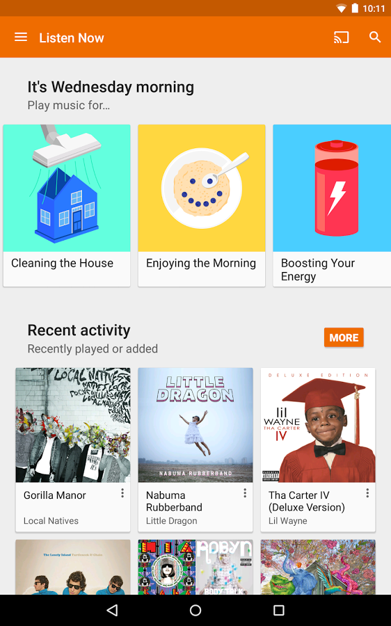 Аналогичный сервис от Google насчитывает более 35 млн песен. Также Google Play Music дает возможность загрузить до 50 тыс. своих треков и свободно слушать их. Синхронизация доступна между разными устройствами и платформами: плейлисты перебрасываются с iOS на Android.