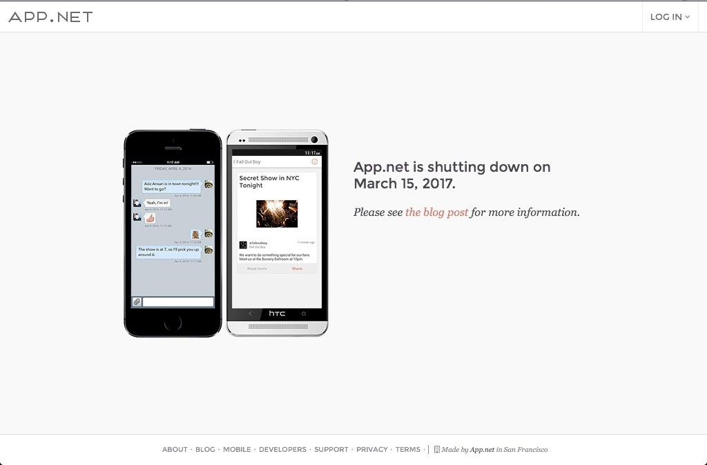 App.net, известная как социальная сеть, свободная от рекламы, прекратит свое существование 14 марта 2017 года. Как сообщили основатели сети Далтон Колдуэлл и Брайан Берг в официальном блоге App.net, регистрация новых пользователей останавливается, ожидающие продления подписки отключаются. К марту 2017 года все данные пользователей будут удалены из социальной сети.