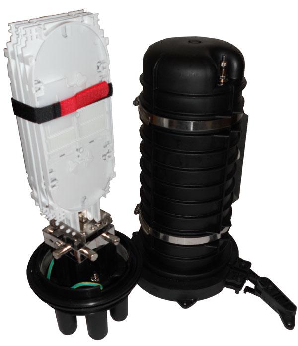 Особенность – технология изготовления. Изделия выглядят в виде герметичных боксов, в производстве которых используется полимер. Муфта снабжена пустотелыми штуцерами для вывода кабелей. Внутри изделия находятся сплайс-кассеты для укладки на них сварных оптоволоконных участков.