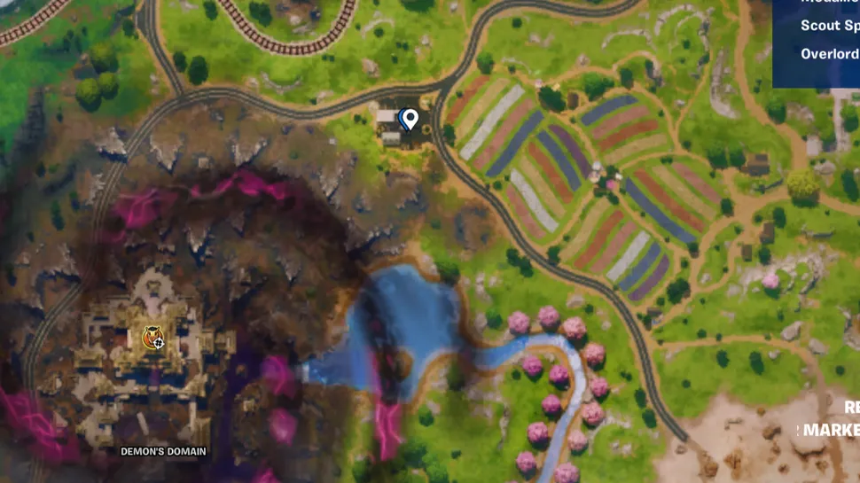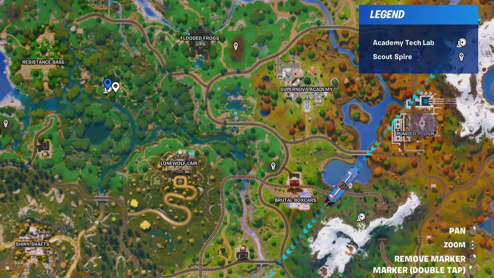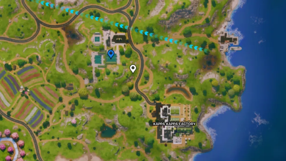 Надежное место для высадки с самого начала 6-й главы. Если вы находитесь в этой точке интереса в одиночку, приземлитесь на конструкцию справа, отмеченную на картинке выше, и разбейте грузовик Slurp под ней, чтобы получить полные щиты. Если там уже кто-то приземлился, сначала возьмите оружие.