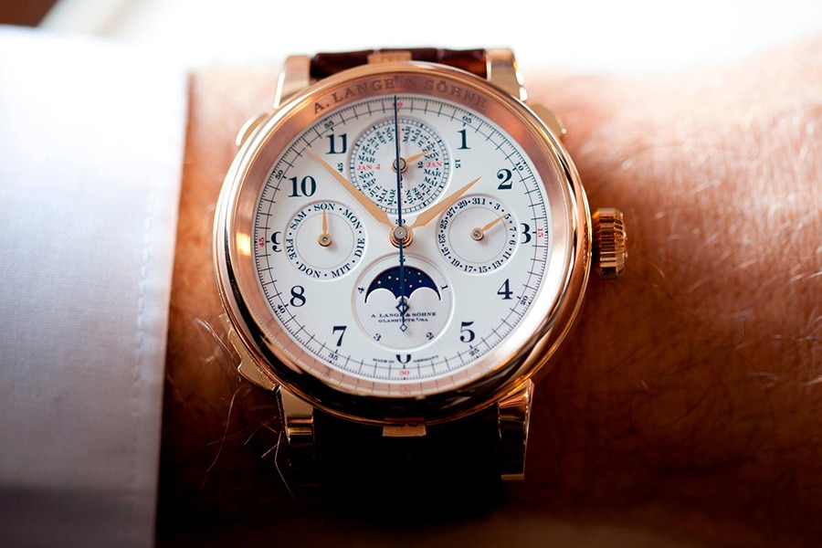 На изготовление Grand Complication от Lange & Söhne уходит почти целый год, и эти наручные часы всячески напоминают вам об этом. Самый дорогой хронограф люксового бренда, состоящий из 876 деталей, имеет массивный золотой корпус диаметром 50 мм и толщиной 20 мм.
