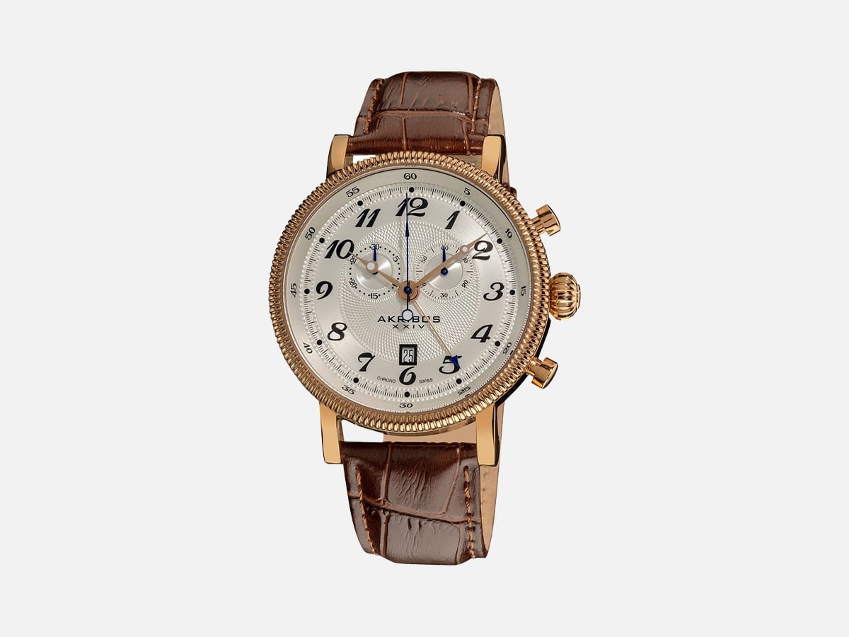 Эти часы сочетают в себе современный стиль и нотку винтажности. Это красивый дизайн с тремя циферблатами хронографа с функцией даты, заключёнными в корпус из стали розового золота. Часы поставляются с тёмно-коричневым кожаным ремешком с тиснёным рисунком под крокодиловую кожу.