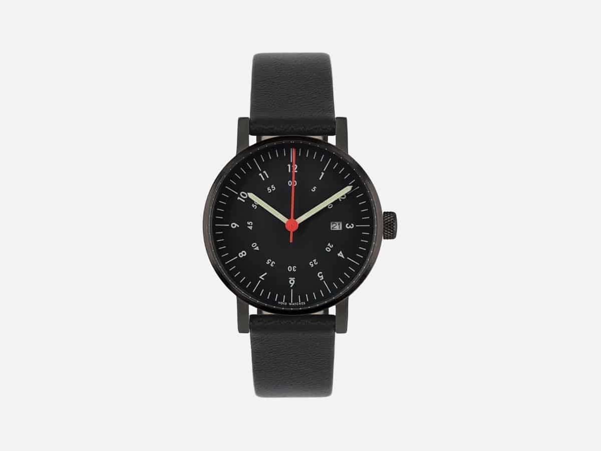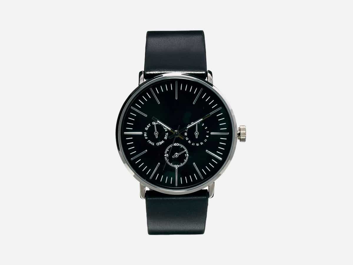 Это тёмные часы, от циферблата до корпуса и ремешка. Секундная стрелка выделяется своим цветом, и я бы хотел, чтобы так же было с остальными стрелками и индикаторами. Чёрный корпус выполнен из нержавеющей стали, а ремешок — из качественной 24-миллиметровой чёрной кожи.