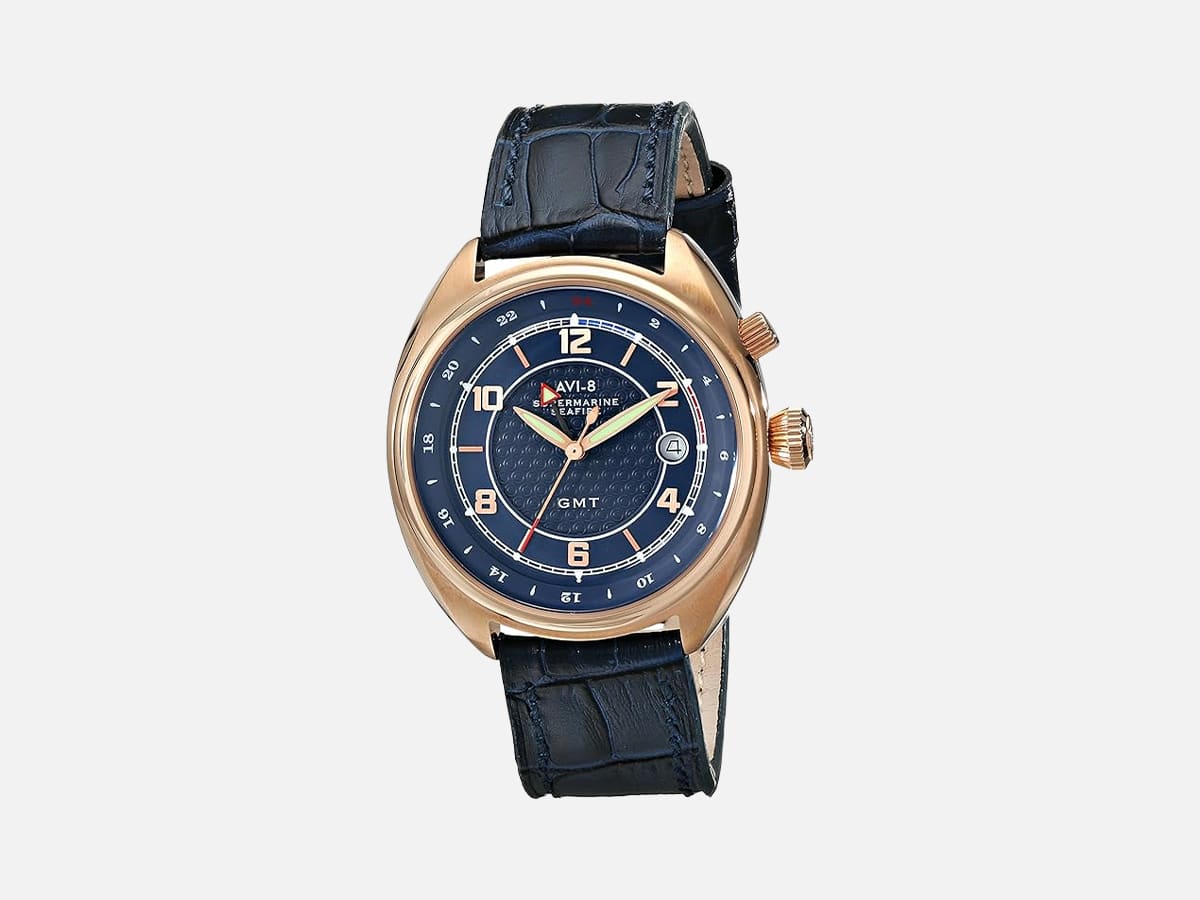 Корпус из цельной нержавеющей стали отполирован до почти медного цвета. На циферблате легко читаются цифры, а также отображается дата и второй часовой пояс. Ремешок сшит вручную из высококачественной кожи.