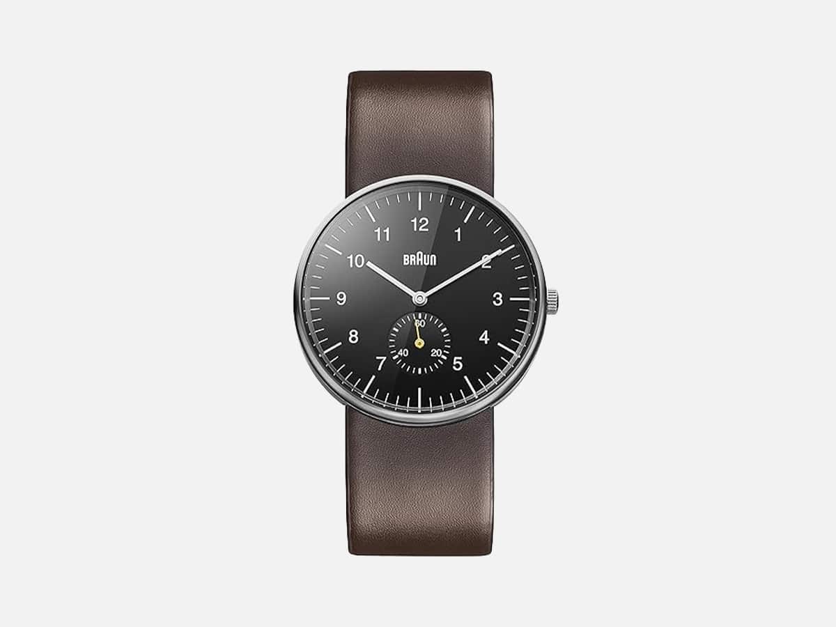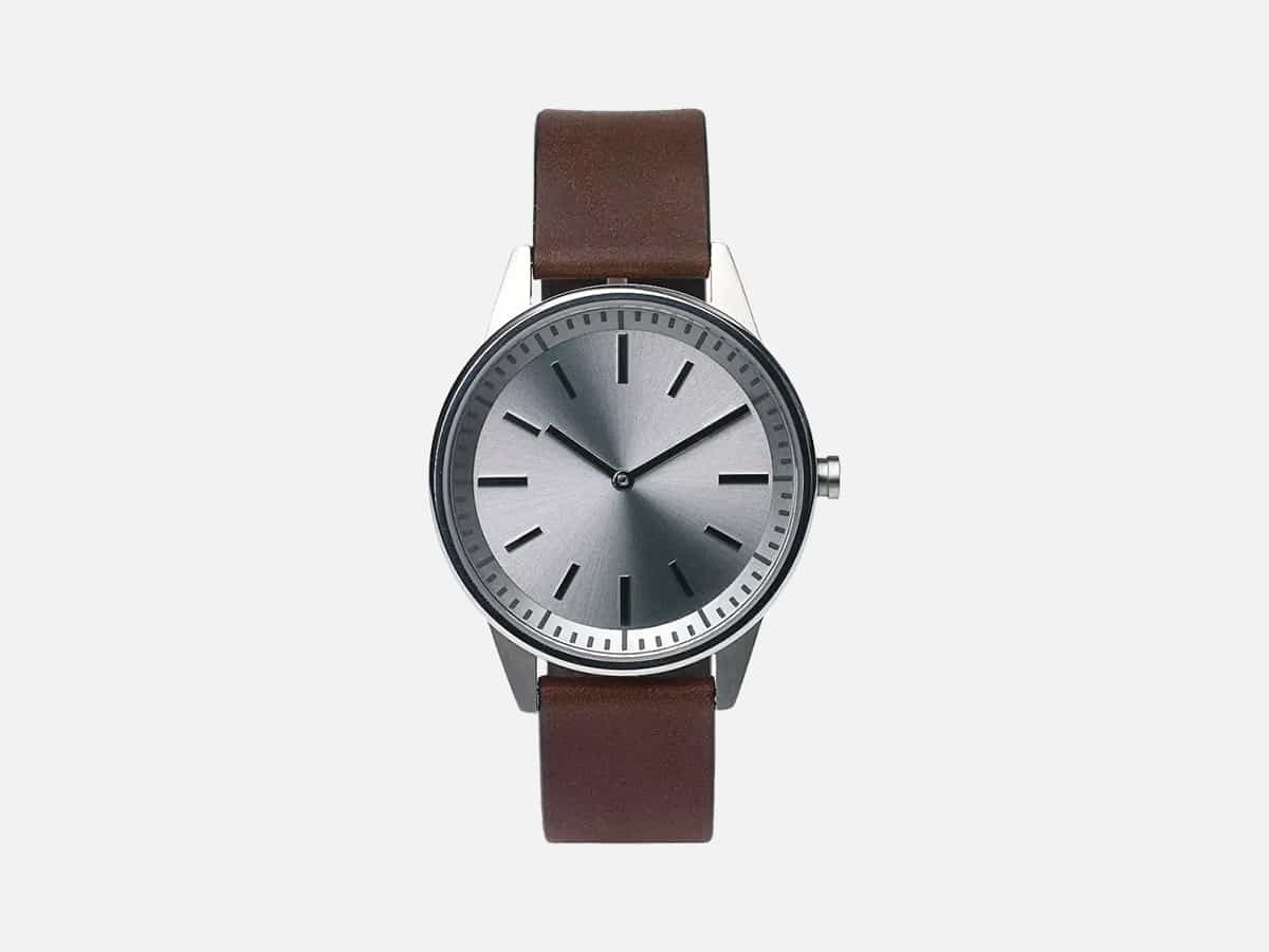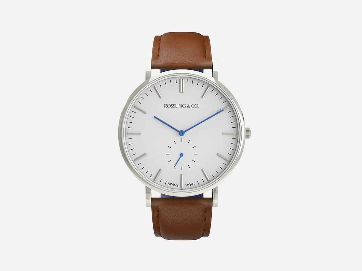 Классические минималистичные часы от Rossling & Co со сверхтонким корпусом, циферблатом с эффектом солнечных лучей, кварцевым механизмом, диаметром корпуса 40 мм и коричневым кожаным ремешком. Дизайн в стиле Баухаус неподвластен времени, и эти часы можно носить практически с чем угодно.