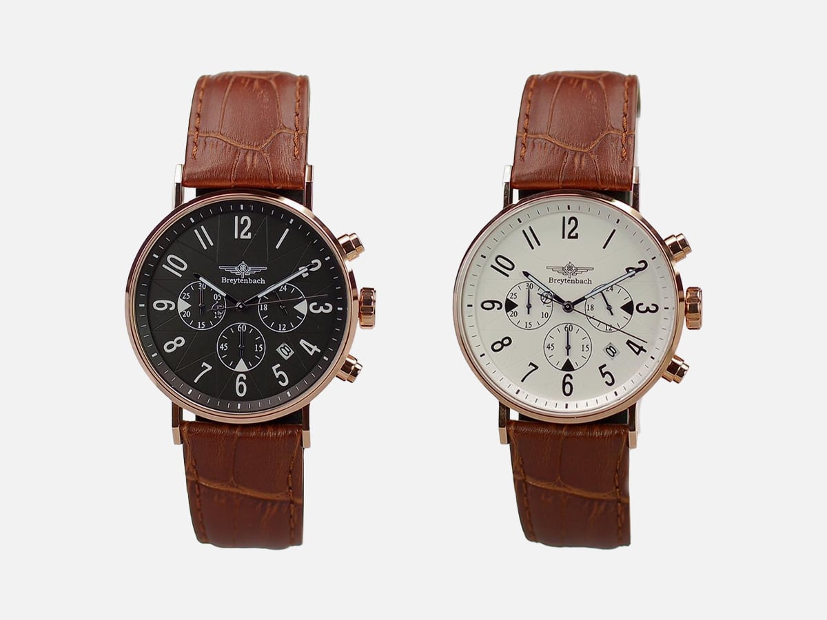 У этих швейцарских хронографов белый циферблат и корпус розового цвета. Крупные чёрные цифры легко читаются, а дата отображается над отметкой «6 часов». Коричневый ремешок из натуральной кожи с крокодиловым узором дополняет образ.