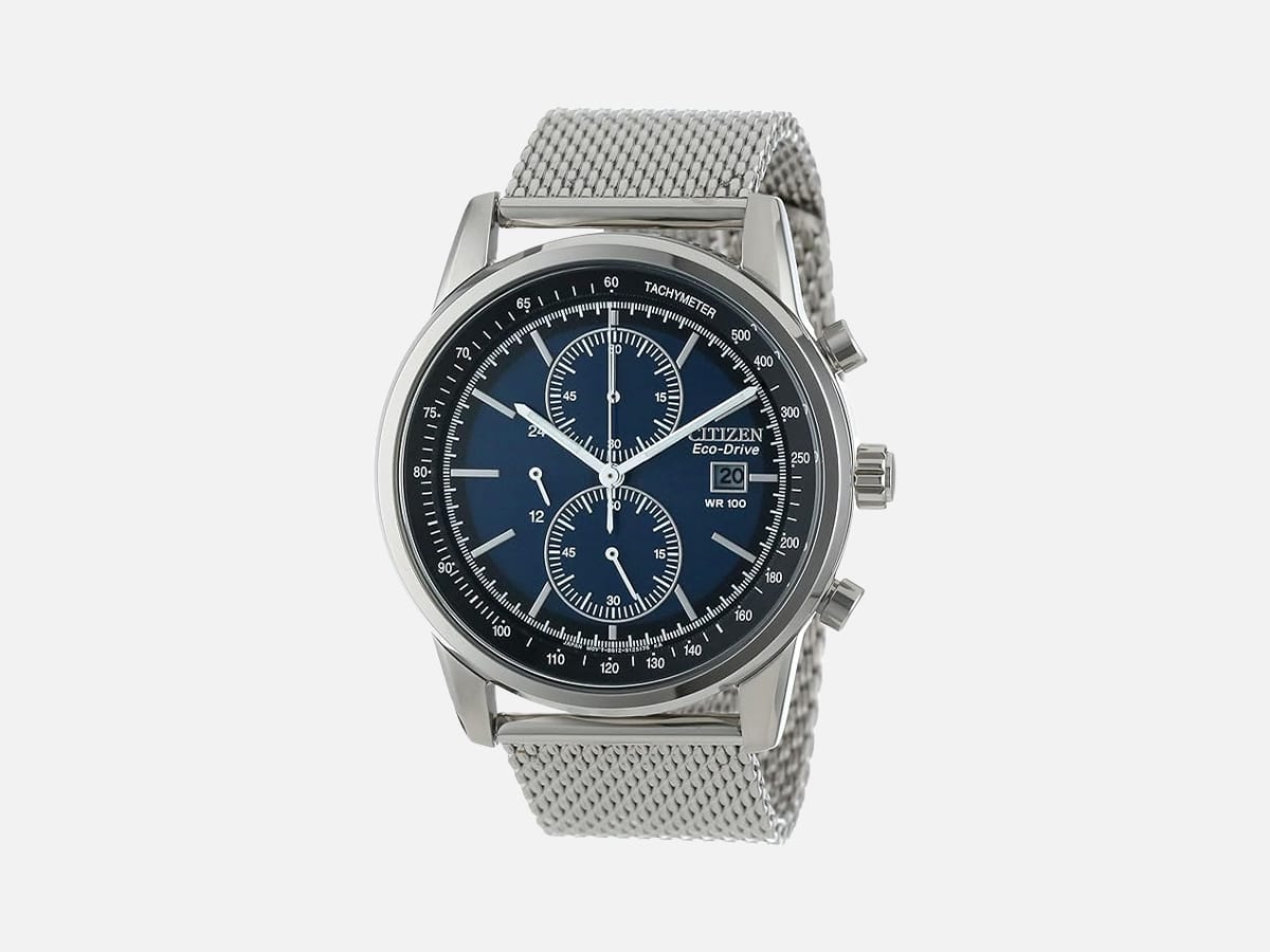 Элегантные и изысканные часы с тремя отдельными циферблатами хронографа на синем внутреннем и чёрном внешнем циферблатах. Другие функции включают отображение даты и тахиметра, а питание осуществляется от света, поэтому им не нужна батарея. В комплект входит сетчатый ремешок из нержавеющей стали. (26 тыс. руб.)
