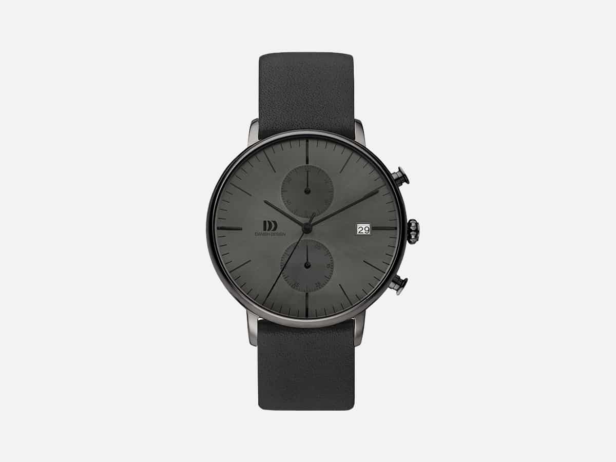 Эти хронографы с тёмно-серым циферблатом и функцией даты имеют корпус из матовой нержавеющей стали и чёрный кожаный ремешок.