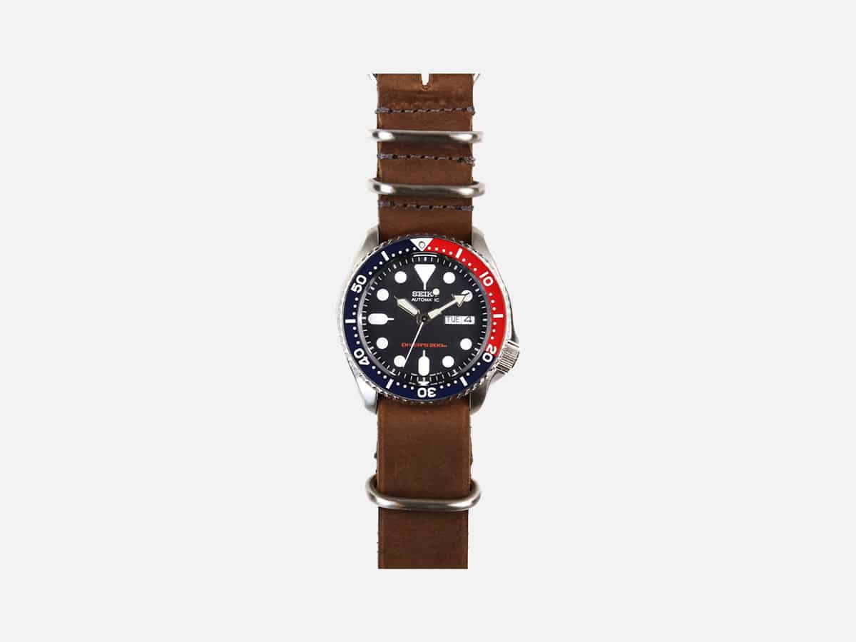 У этих часов для дайвинга большой безель с минутной и часовой стрелками для удобства считывания показаний. Они также оснащены функцией отображения дня недели и даты, а в качестве ремешка можно выбрать кожаный Horween или премиальный Nato.
