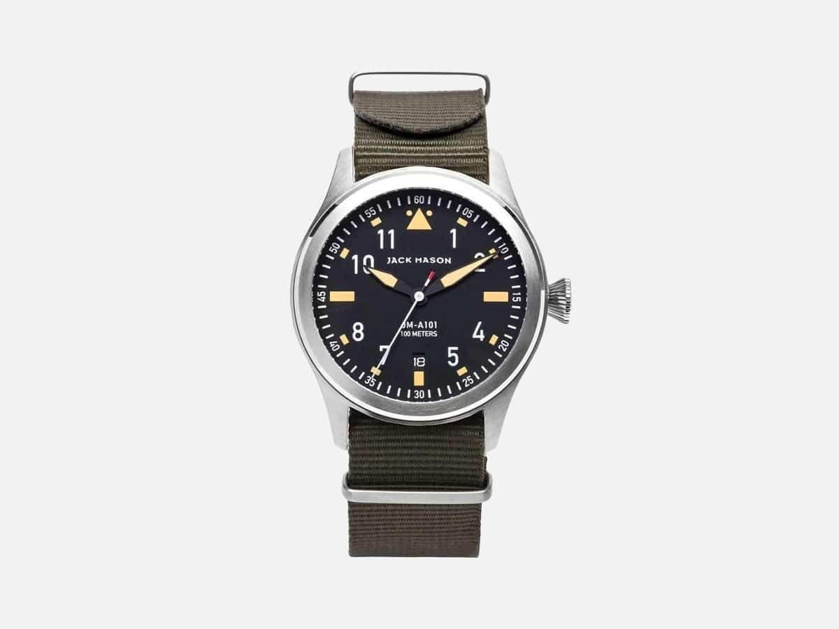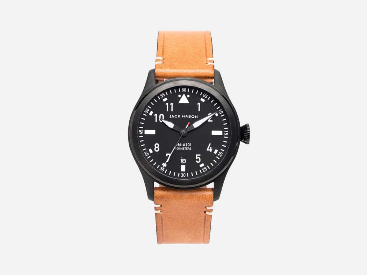 Пилотские часы со всеми дополнениями, этот Jack Mason Aviator выглядит по-военному и брутально. Корпус из нержавеющей стали с черным PVD-покрытием контрастирует с белыми метками и стрелками. Также есть несколько акцентов в цветах американского флага на второй стрелке.