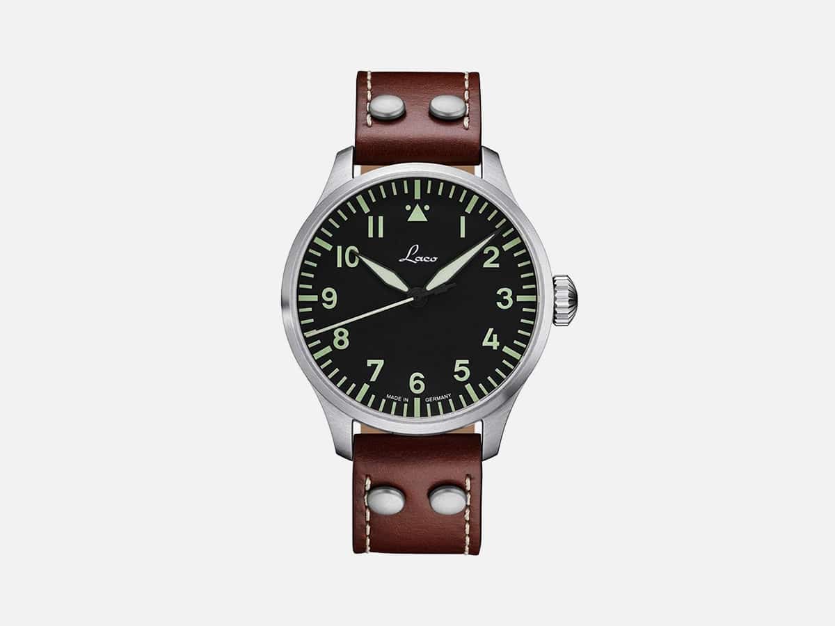 Классический аналоговый пилотский хронограф с чёрным циферблатом и большими светящимися зелёными цифрами. Корпус из нержавеющей стали с коричневым кожаным ремешком.