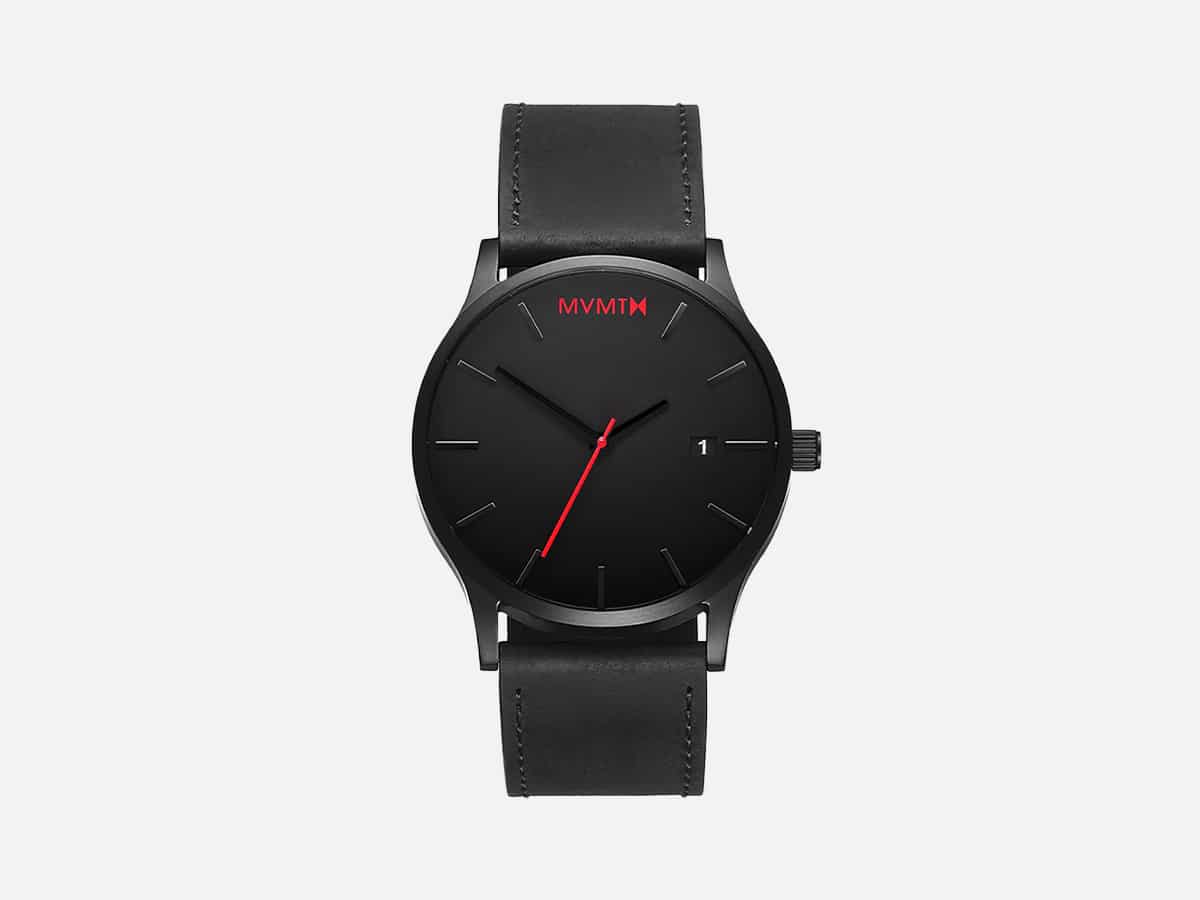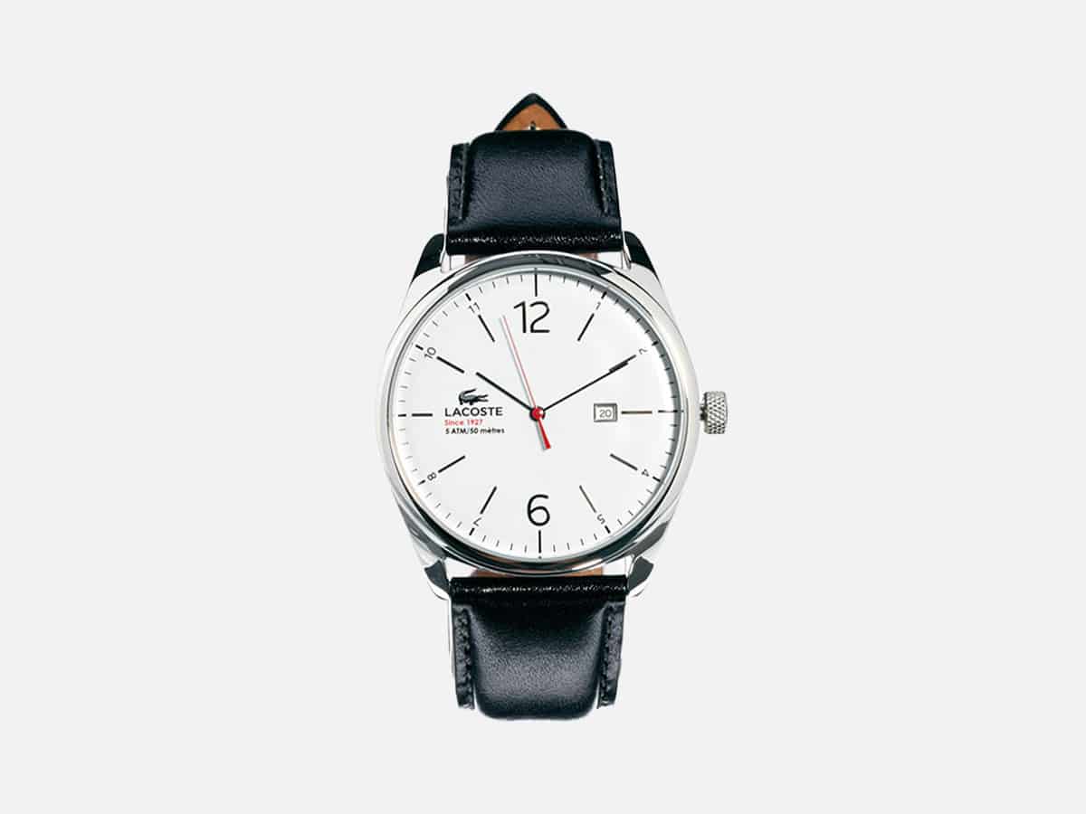 Эти классические и элегантные часы имеют ярко-белый циферблат с красной секундной стрелкой и индикатором даты. Корпус из нержавеющей стали с чёрным кожаным ремешком водонепроницаем до 3 АТМ.