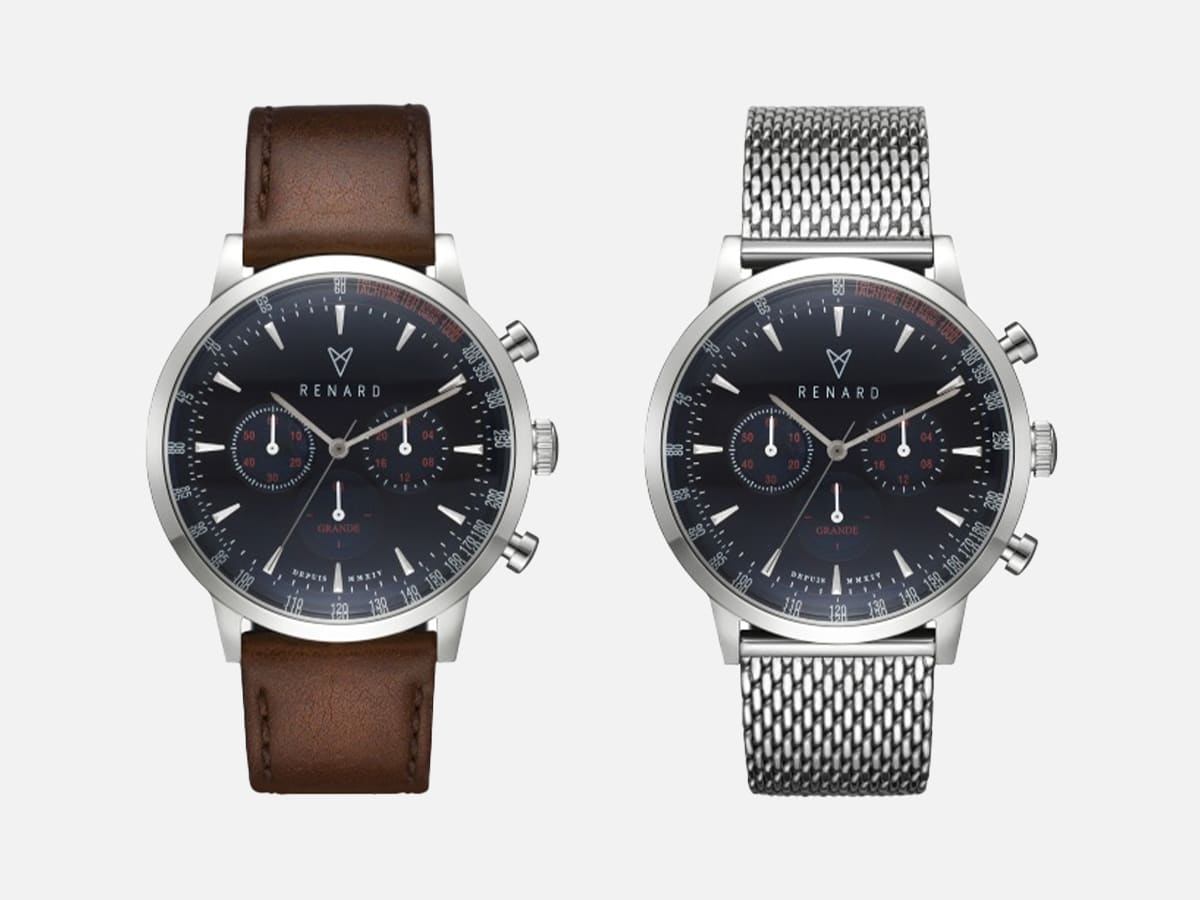 Поразительно элегантные часы-хронограф Grande Collection от Renard представлены в различных цветах, но нашим любимым является глубокий тёмно-синий оттенок циферблата. Куполообразное стекло придаёт часам слегка изогнутую форму, благодаря чему они прекрасно сидят на запястье. Водонепроницаемость до 5 АТМ, японский кварцевый механизм HMS.