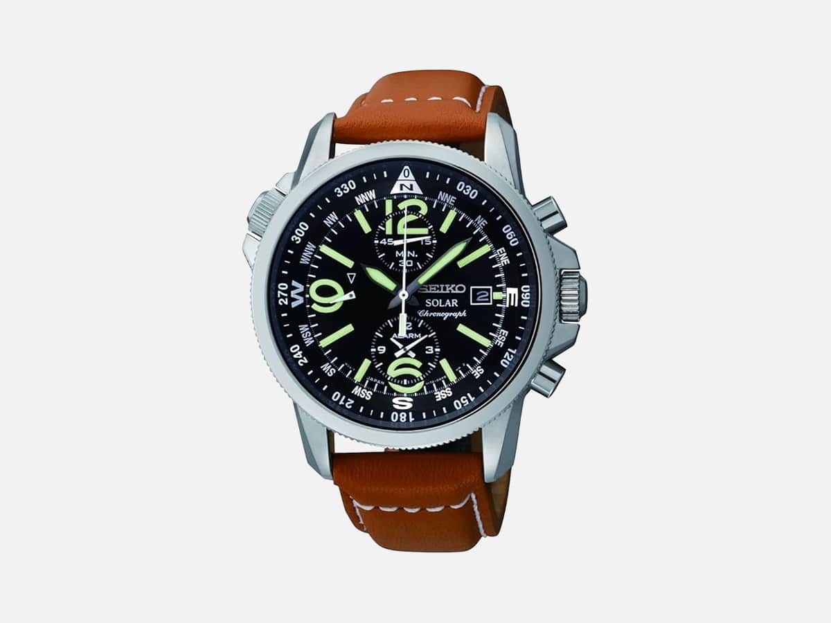 Эти высокотехнологичные часы с питанием от солнечной энергии оснащены циферблатом с компасом, хронографом с будильником и водонепроницаемостью до 10 АТМ. Корпус выполнен из полированной стали и оснащён классическим коричневым кожаным ремешком.