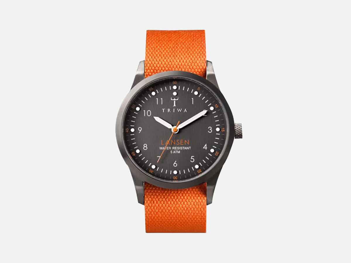 Чёрный циферблат с белыми цифрами заключён в корпус из матовой нержавеющей стали и дополнен оранжевым ремешком из 100% хлопка.