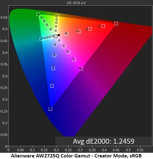 Отслеживание цветового охвата AW2725Q — хрестоматийный пример точности. Все шесть контрольных цветов остаются на своих тоновых шкалах, с небольшим перенасыщением в красном, пурпурном и синем каналах. Это одна из лучших диаграмм, которые я видел на сегодняшний день.