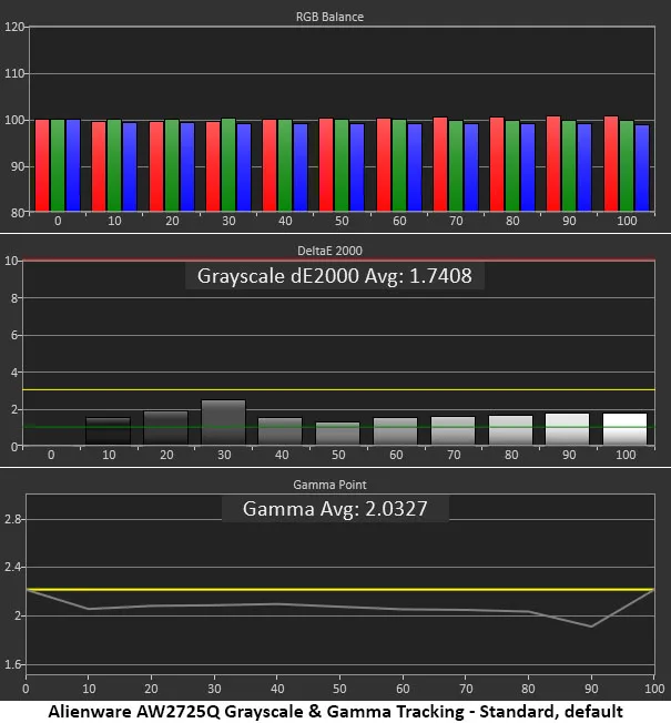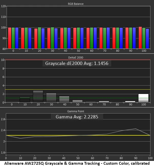 Почти все OLED-дисплеи, которые я тестировал, можно использовать без калибровки, и AW2725Q — не исключение. Результат 1,74 dE вполне соответствует визуальному идеалу (ошибки ниже 3 dE обычно не видны глазу). Единственная причина, по которой я выбрал режим «Пользовательский цвет» (Custom Color), — это гамма. Она там заметно лучше, поэтому стоит заодно подкрутить ползунки RGB для ещё более точного отслеживания оттенков серого.