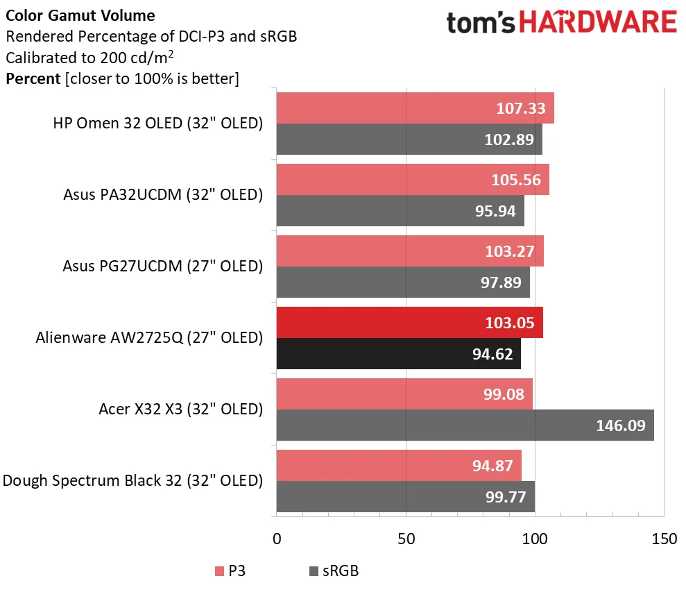 В тесте на цветовой объем (Gamut Volume) AW2725Q показал хорошие результаты: охват DCI-P3 составил 103,05%. Это значительно превосходит мониторы без квантовых точек (QD), у которых охват обычно ниже 100%, но есть несколько экранов с более высокой цветопередачей, например, HP Omen 32 OLED. Хотя эти дополнительные 4% сложно заметить, при сравнении их можно увидеть, особенно в красной части треугольника цветового охвата. Это приятная мелочь, и она ни в коем случае не является решающим фактором.