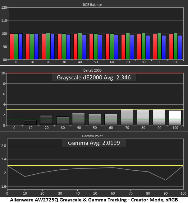 AW2725Q предлагает несколько способов калибровки в зависимости от режима изображения. В стандартном режиме настройки по умолчанию: цвет и оттенки серого соответствуют заявленным, но гамма немного занижена. Вы можете использовать монитор и в этом режиме, но изображение в нём будет не самым лучшим. Если вам нужен sRGB, эта опция доступна в режиме Creator, где также есть предустановки гаммы, но нет настроек цветовой температуры.