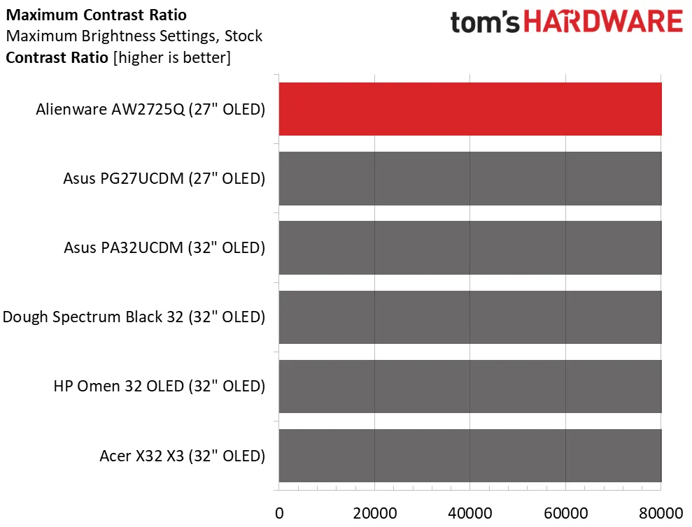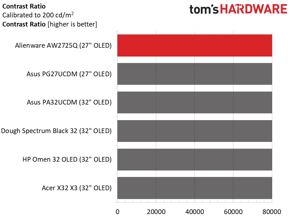 Итоги теста: Контрастность у всех OLED-дисплеев полностью одинаковая. За исключением нескольких более ярких экранов в нашей выборке, AW2725Q обеспечивает производительность на уровне конкурентов. Здесь нет гибкой регулировки поведения яркости, что может быть важным фактором для некоторых пользователей. Для SDR-контента это не так уж критично, а вот для HDR это действительно важно.