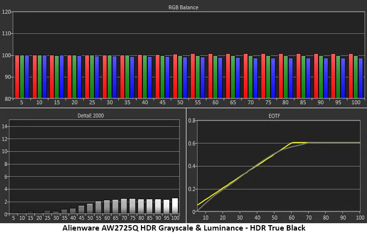 График EOTF отслеживается практически идеально с плавным переходом к тональной компрессии (roll-off) при яркости 60%. Это верное значение для измеренных уровней черного и белого у AW2725Q. Это означает, что все детали остаются видимыми во всем тональном диапазоне, не теряясь в тенях или пересветах.