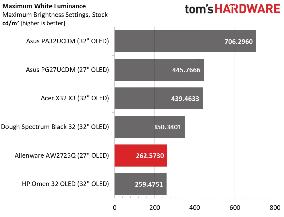 Alienware заявляет пиковую яркость AW2725Q в режиме SDR на уровне 250 нит, что полностью соответствует результатам моего теста (262 нит). Здесь нет функции динамической регулировки яркости в зависимости от заполнения экрана, поэтому результаты измерений одинаковы как для маленьких «окон», так и для заливки во весь экран.