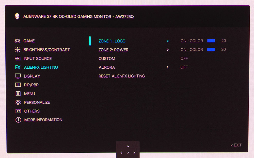 Под центром лицевой панели AW2725Q находится крошечный джойстик, который управляет всеми функциями монитора, за исключением питания, которое включается кнопкой с подсветкой справа.