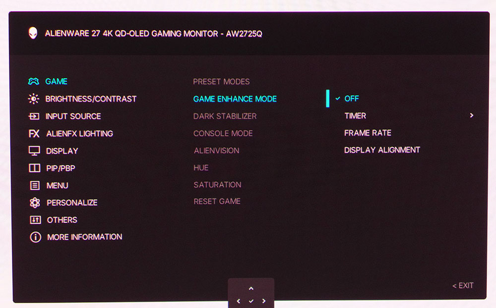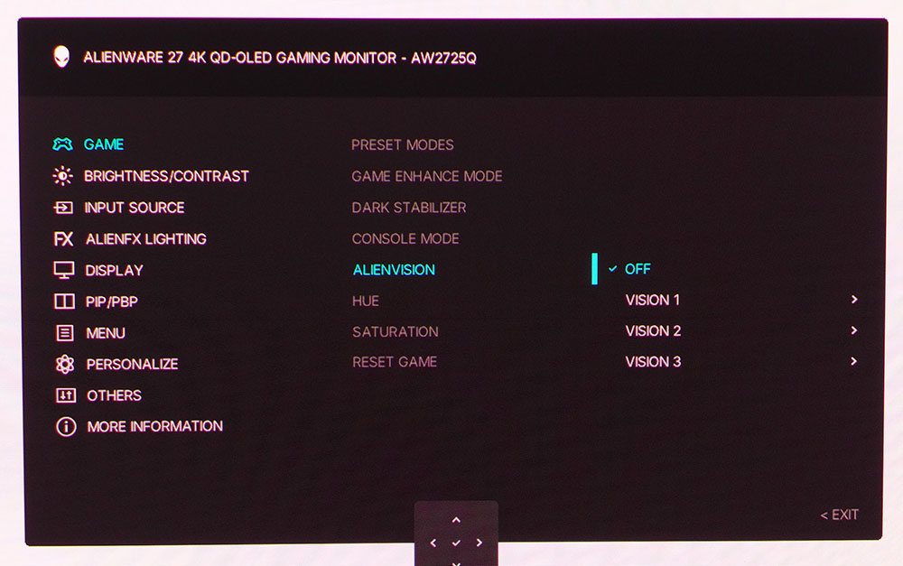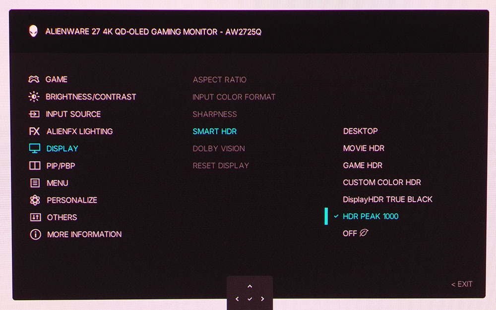 AW2725Q поддерживает форматы HDR10 и Dolby Vision с автоматическим переключением сигнала. Для HDR10 предусмотрено шесть дополнительных режимов изображения, в то время как поддержку Dolby Vision необходимо принудительно активировать в экранном меню.