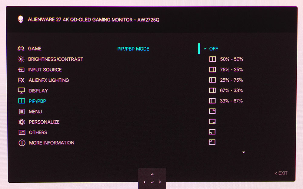 AW2725Q поддерживает полноценные функции PIP и PBP, позволяющие просматривать два изображения одновременно. PBP поддерживает пять вариантов разделения экрана, а окно PIP может отображаться в любом углу.