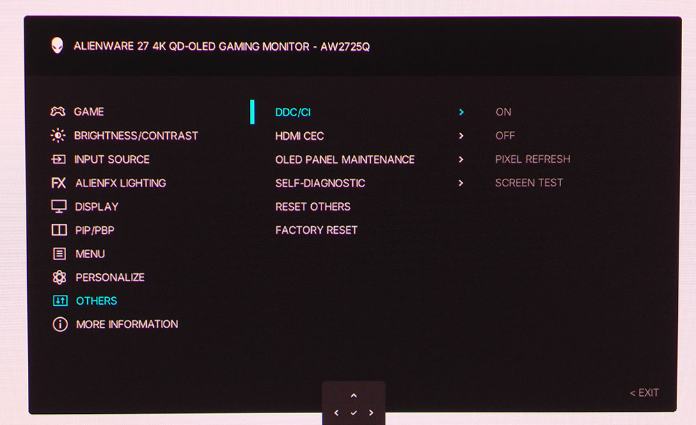 Параметры обслуживания панели просты, поскольку предусмотрен только один параметр — обновление пикселей. Он запускается автоматически, когда внутренние датчики AW2725Q определяют необходимость обновления, исходя из количества часов работы и времени, проведенного на высокой яркости. Состояние панели всегда отображается в верхней части экрана. Если индикатор становится красным, процедура обновления запустится сразу после прекращения использования монитора. Это меню также позволяет сбросить все настройки до заводских.